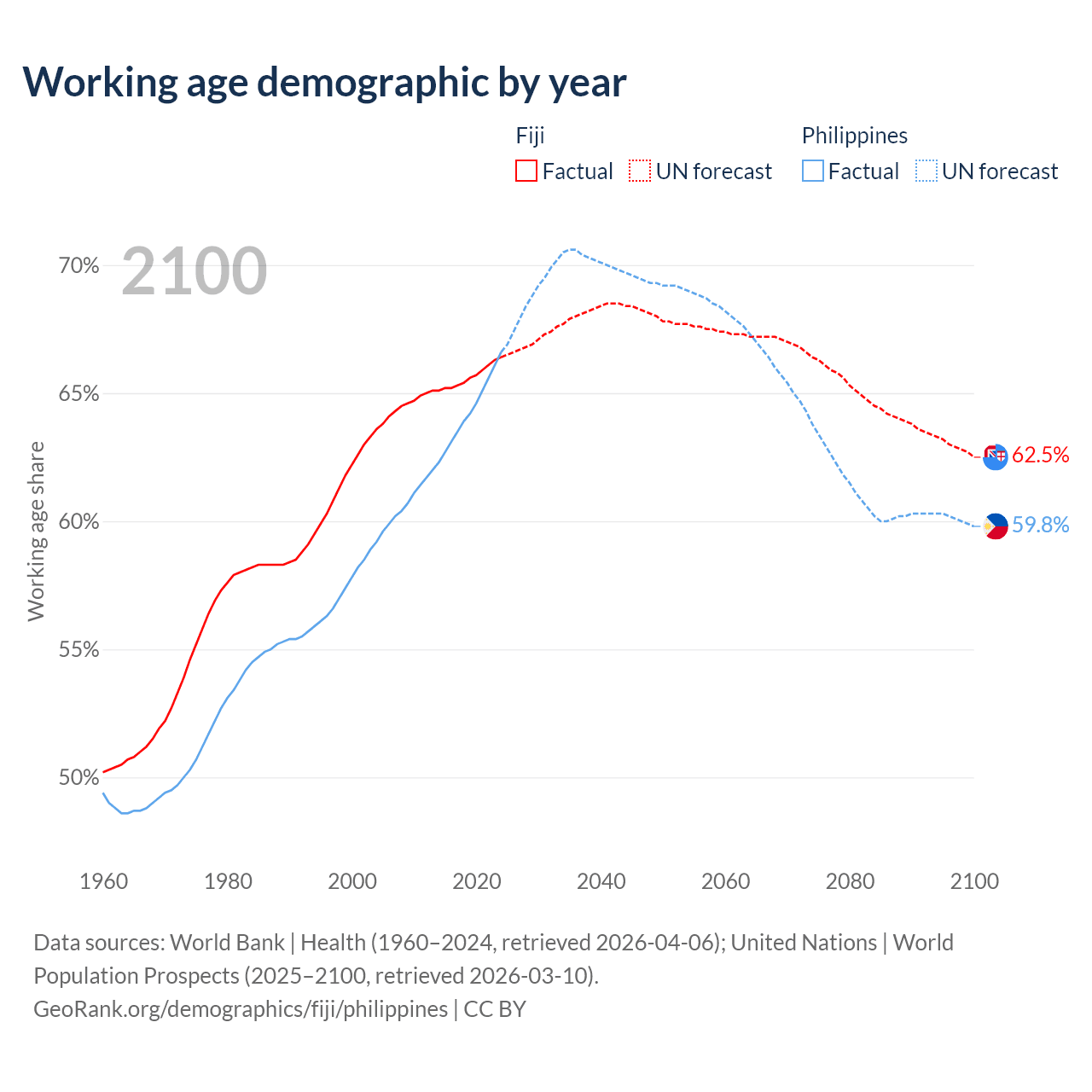 Median age Fiji vs Philippines, 1960-2100