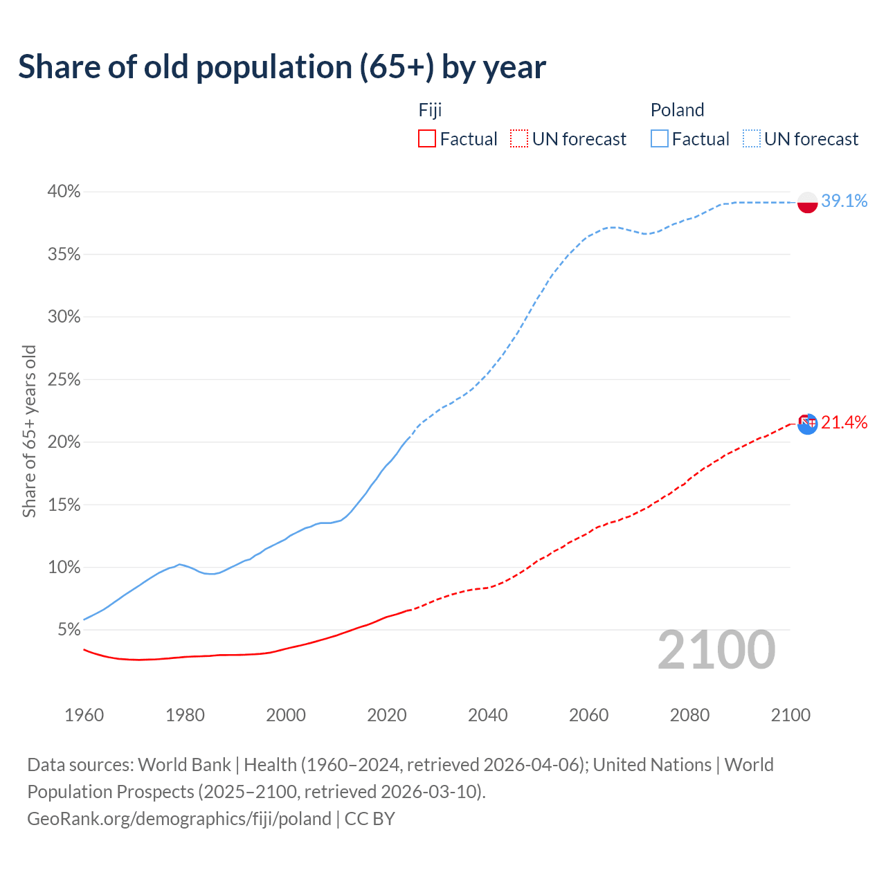 - The share of old-age demographic (65+) in Fiji is 6.49% vs 20.1% in Poland.