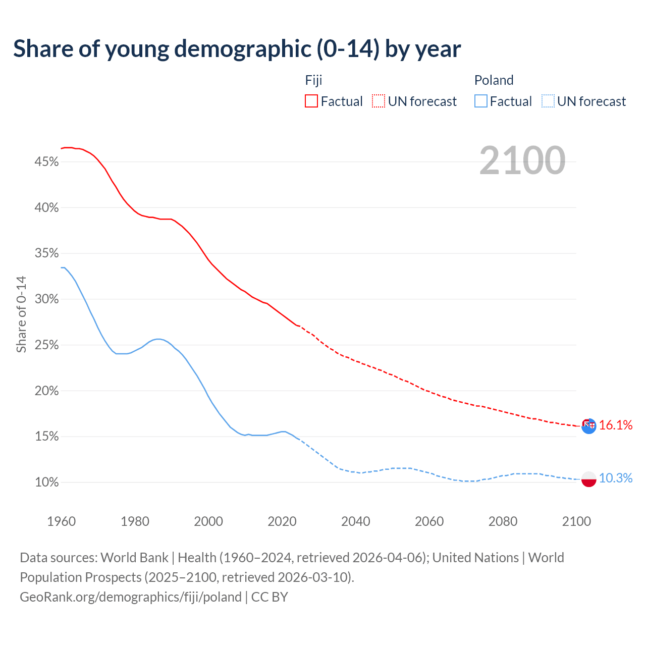- The share of young demographic (0-15 years old) in Fiji is 27.1% vs 14.8% in Poland.