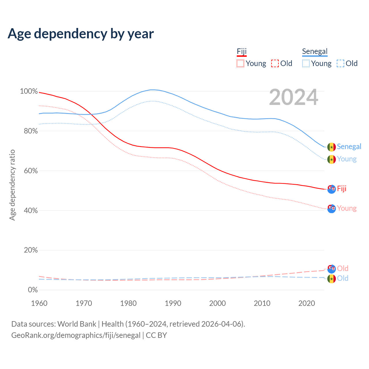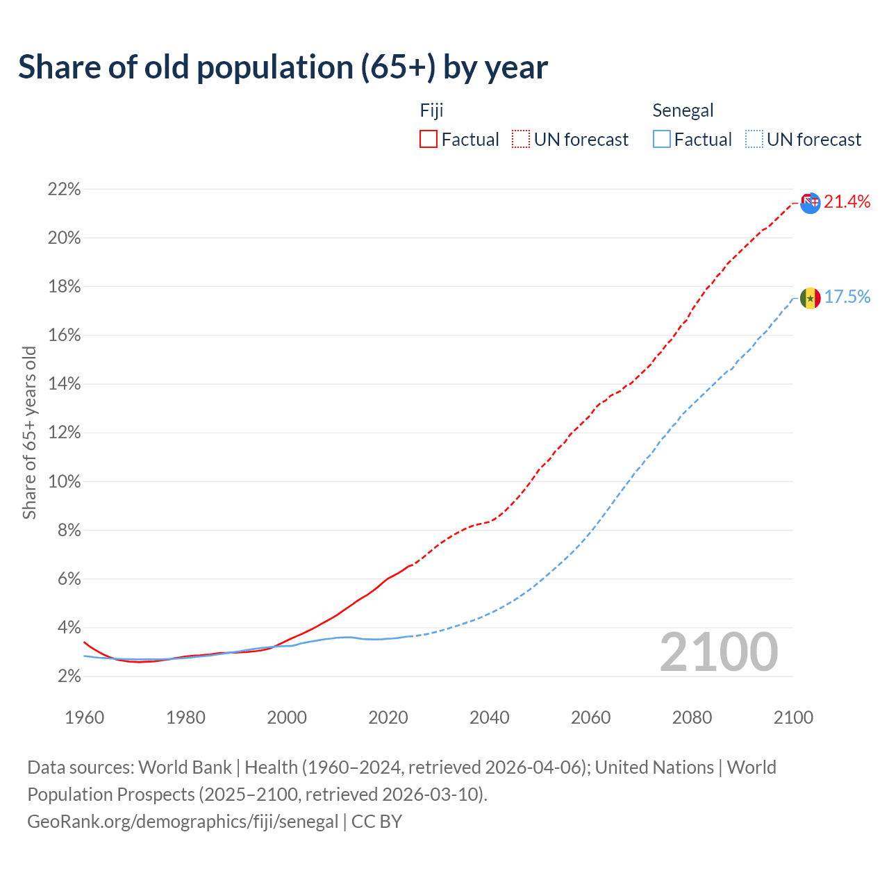 - The share of old-age demographic (65+) in Fiji is 6.49% vs 3.62% in Senegal.