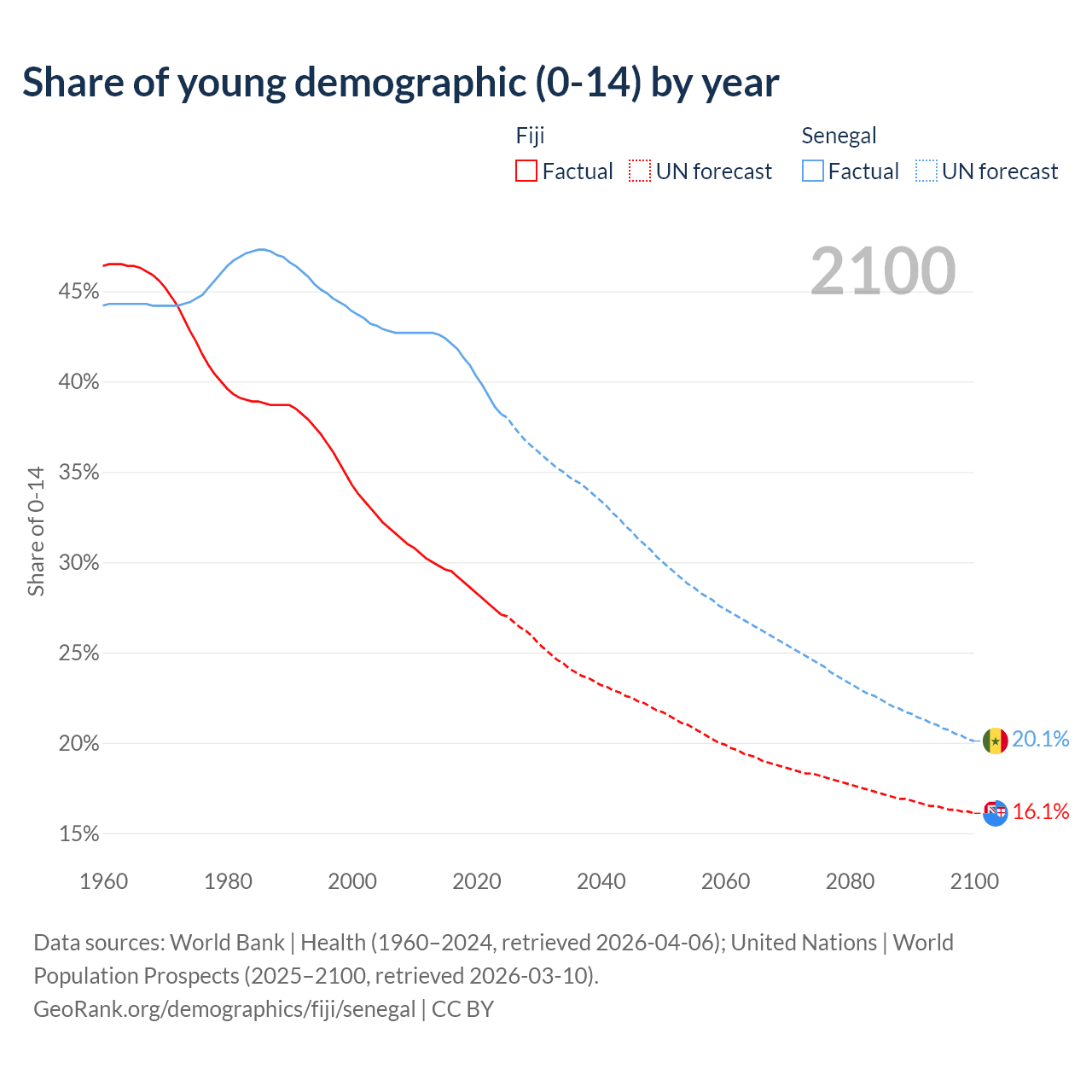 - The share of young demographic (0-15 years old) in Fiji is 27.1% vs 38.2% in Senegal.