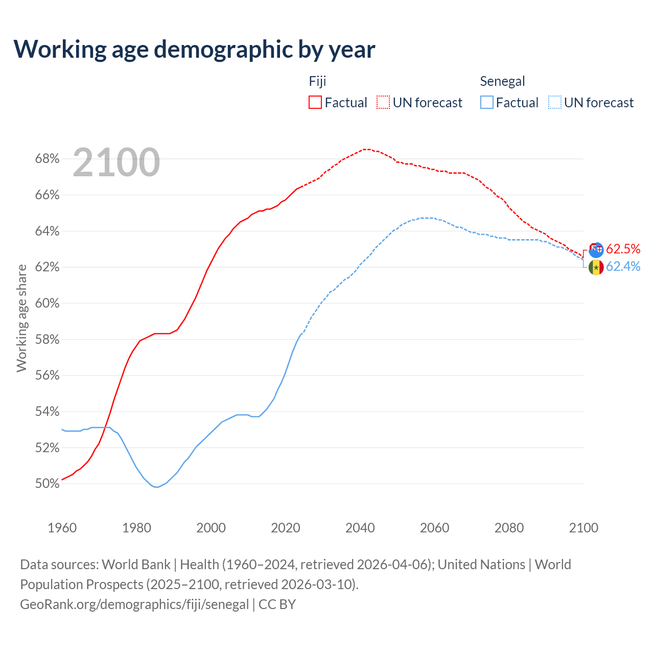 - Fiji has 623K working age adults (aged 15-64) vs 11.3M in Senegal.