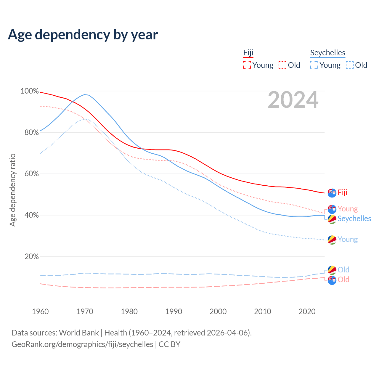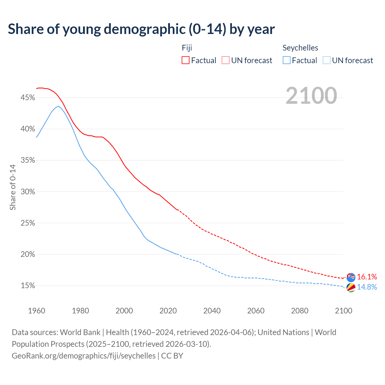 - The share of young demographic (0-15 years old) in Fiji is 27.1% vs 20% in the Seychelles.