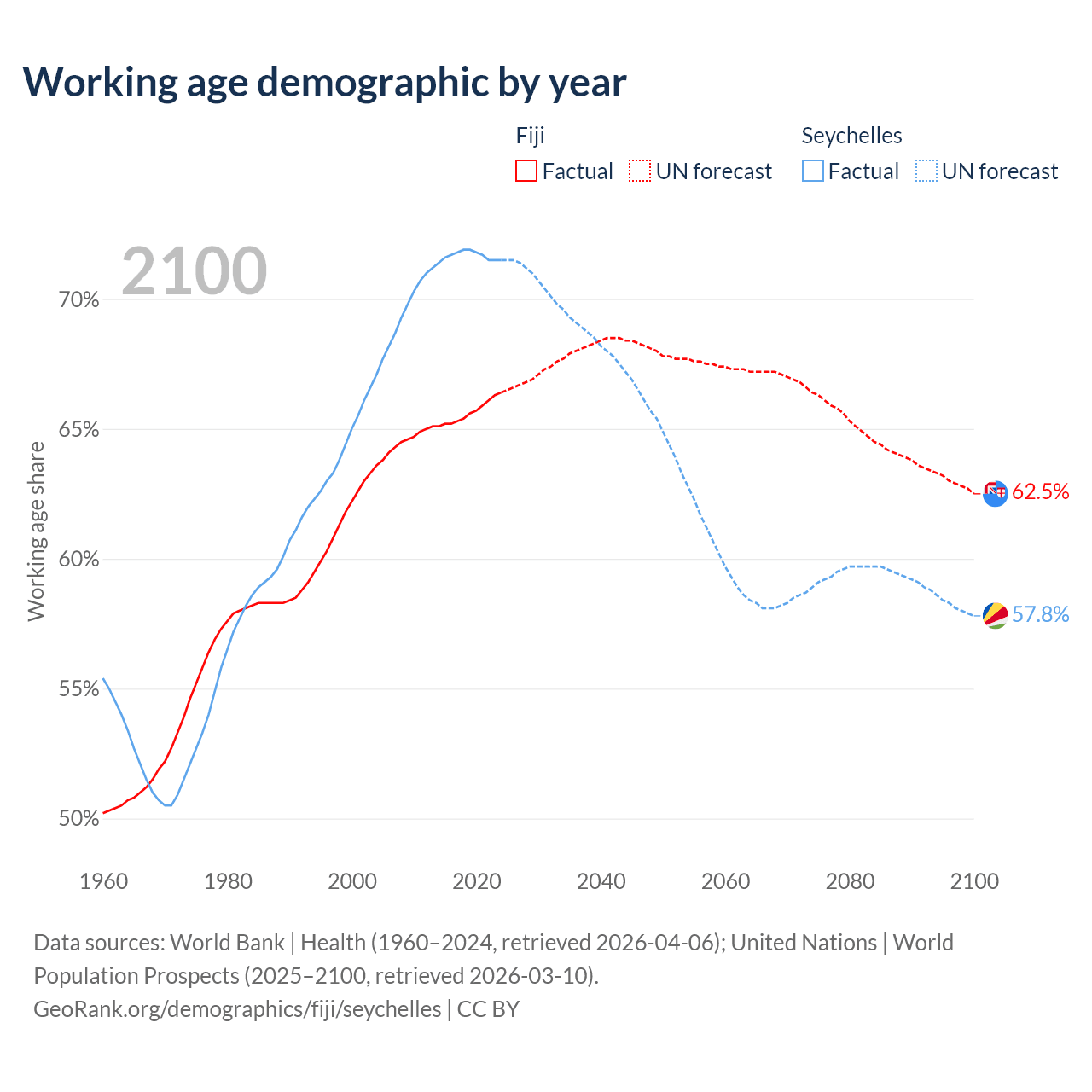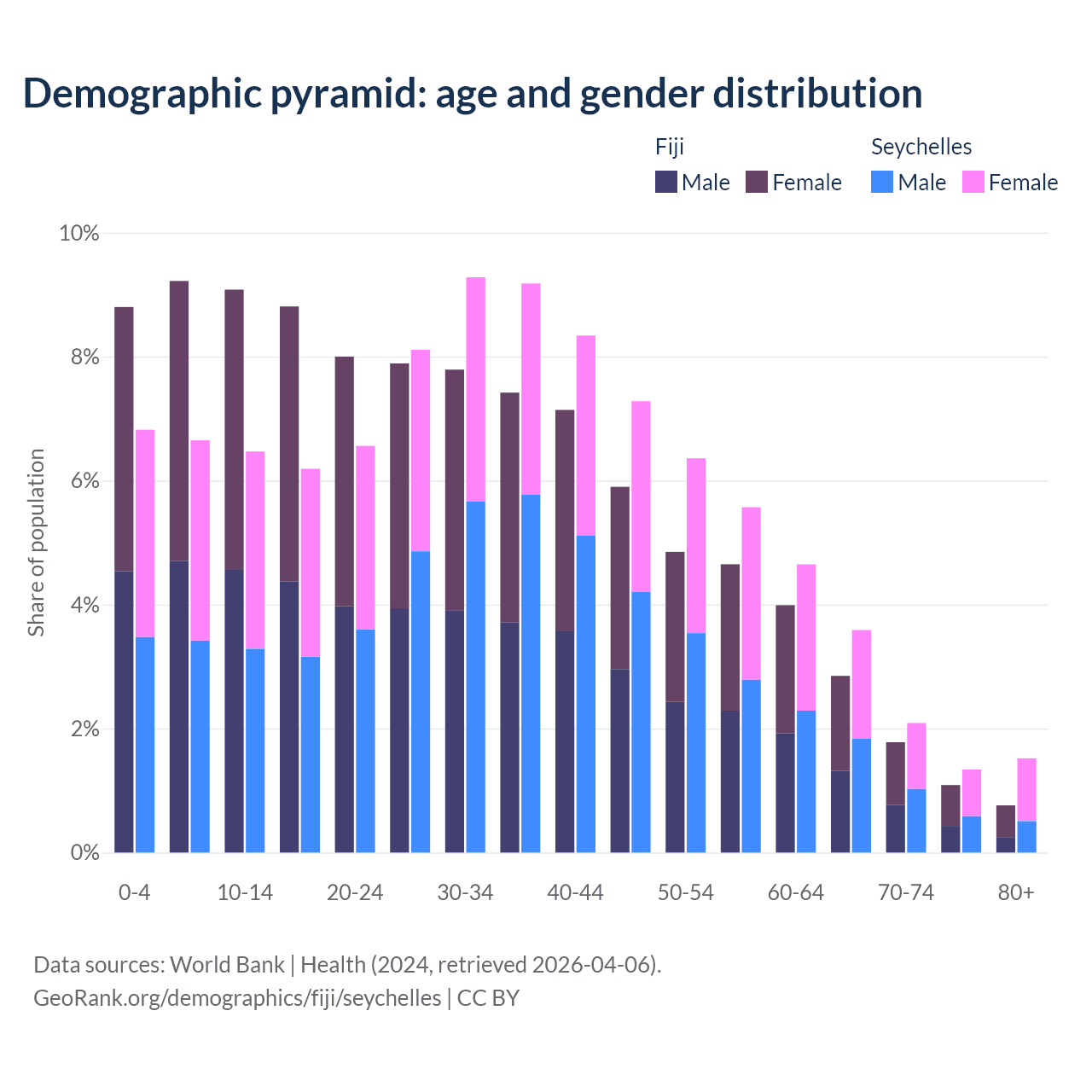 - The share of old-age demographic (65+) in Fiji is 6.49% vs 8.54% in the Seychelles.