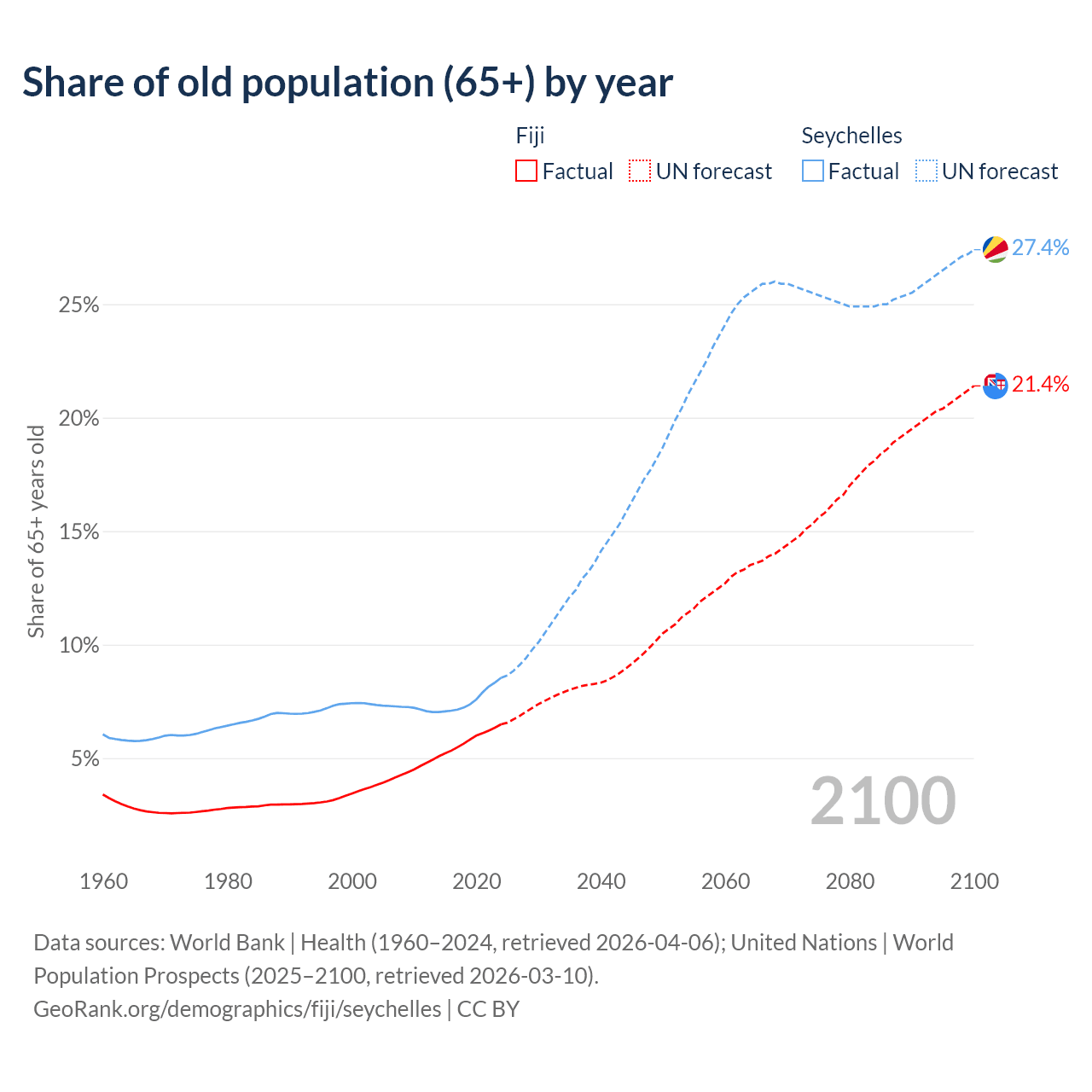 The share of older people aged 65 and over is 6.49% in Fiji and 8.54% in the Seychelles. Life expectancy in Fiji compared to the Seychelles .