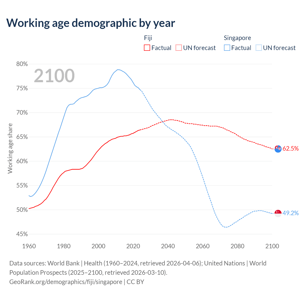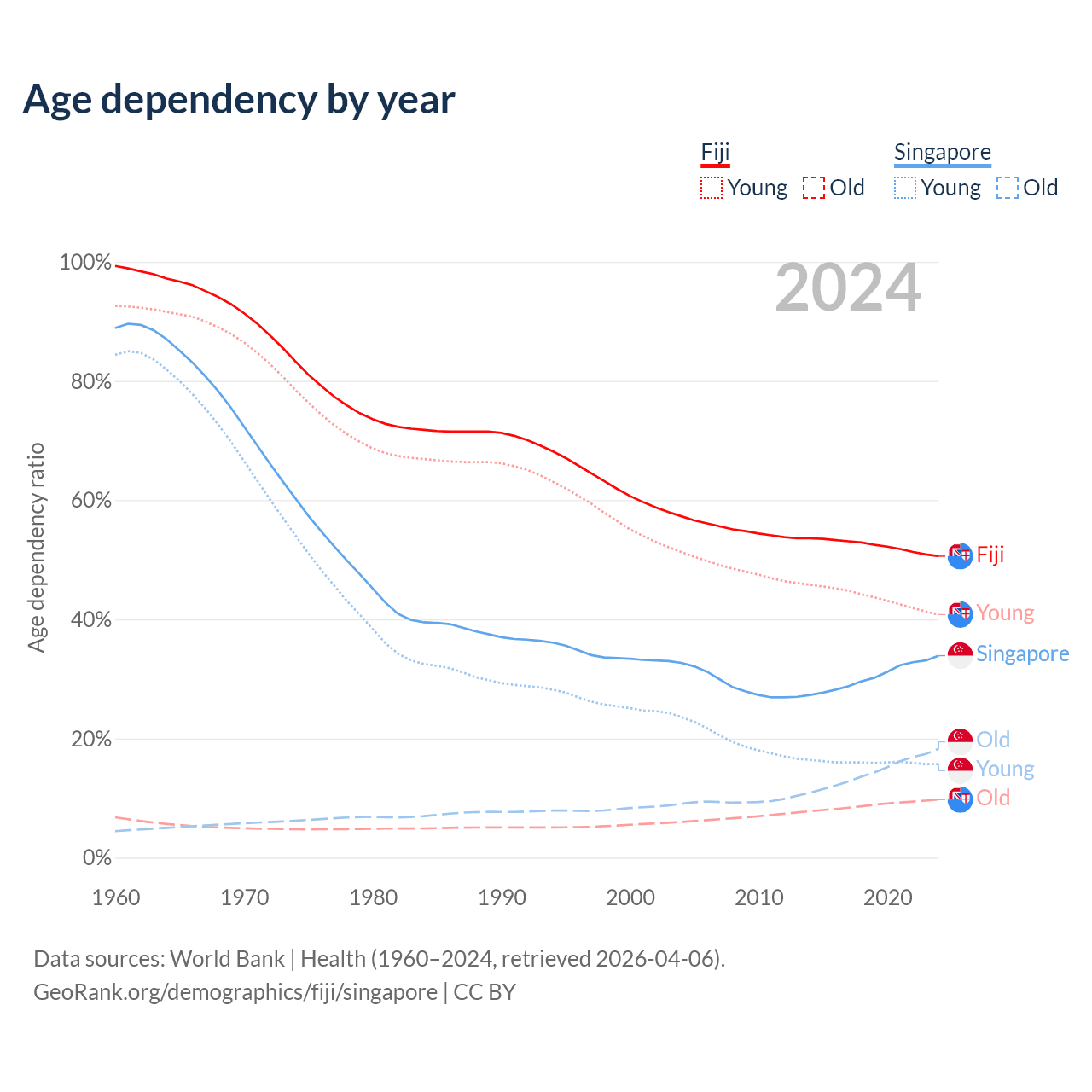 The share of older people aged 65 and over is 6.49% in Fiji and 13.7% in Singapore. Life expectancy in Fiji compared to Singapore .