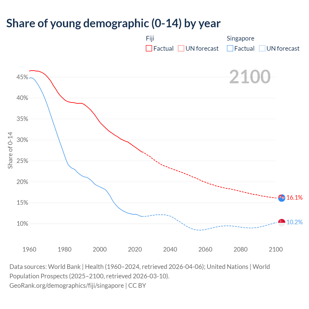 - The share of young demographic (0-15 years old) in Fiji is 27.1% vs 11.7% in Singapore.