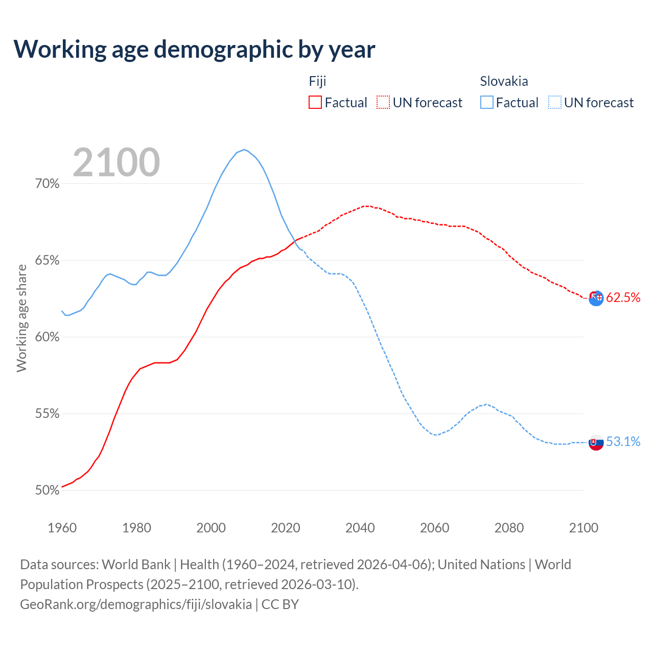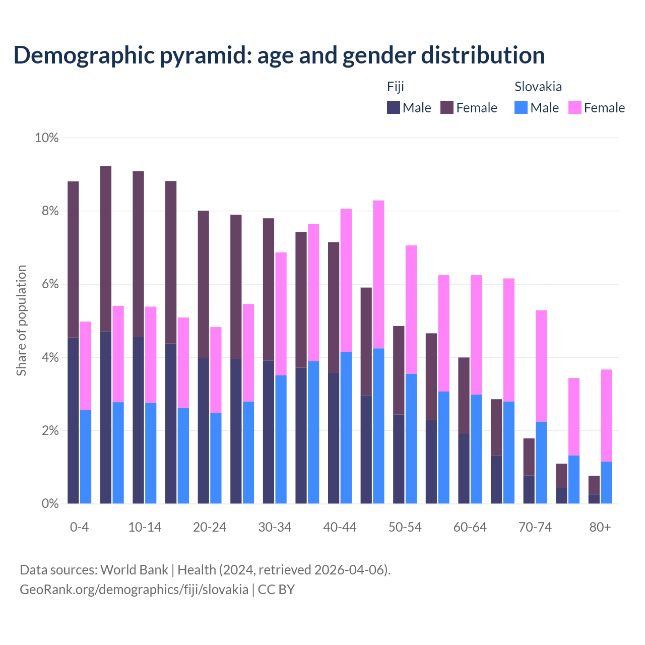 - The share of old-age demographic (65+) in Fiji is 6.49% vs 18.5% in Slovakia.