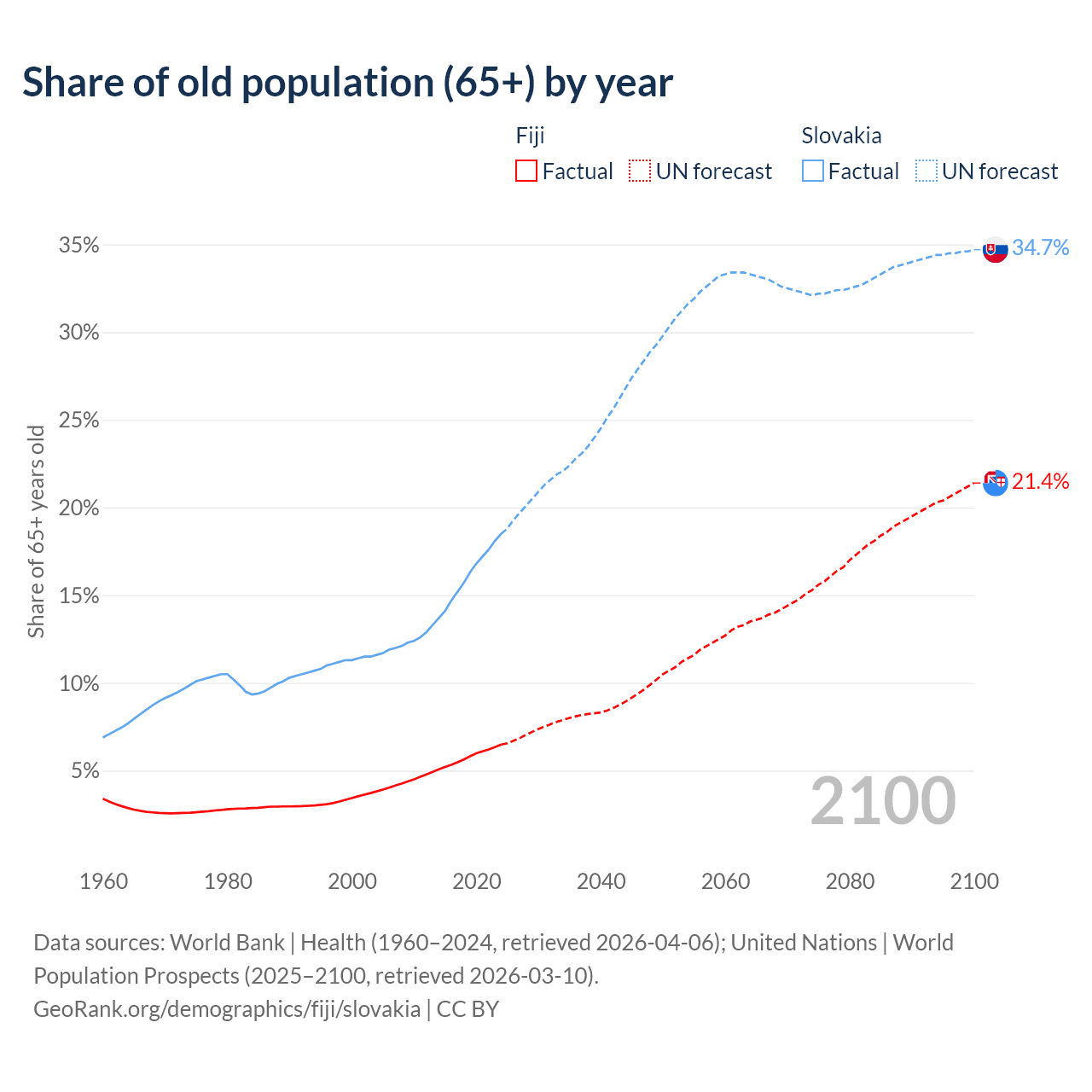 The share of older people aged 65 and over is 6.49% in Fiji and 18.5% in Slovakia. Life expectancy in Fiji compared to Slovakia .