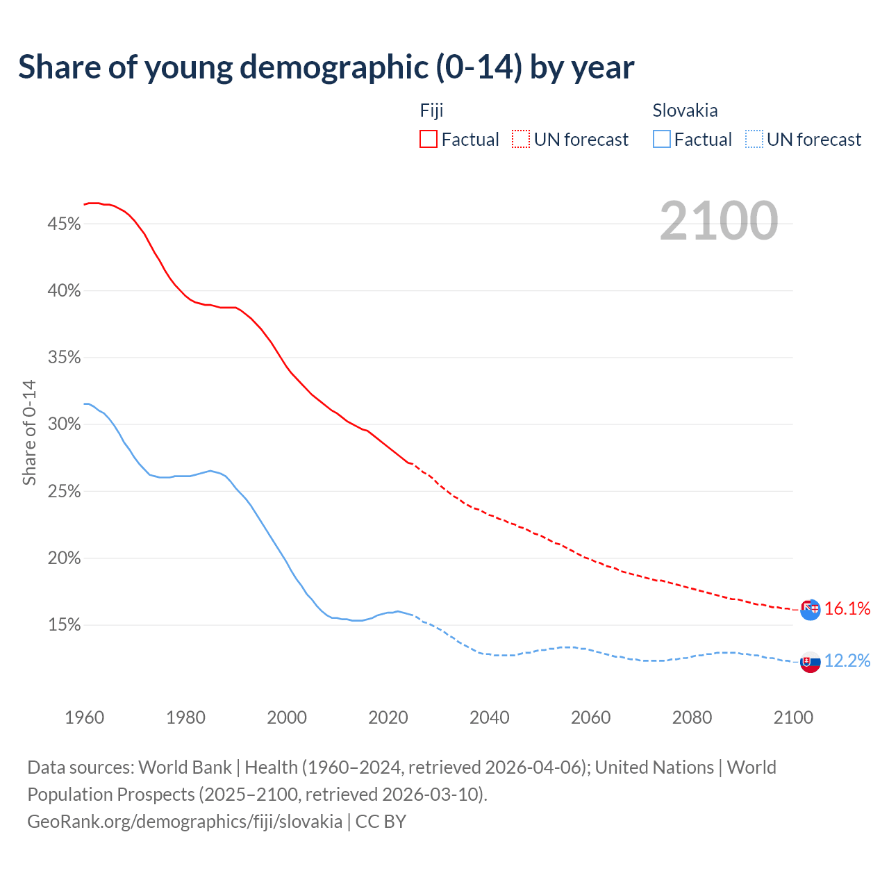 - The share of young demographic (0-15 years old) in Fiji is 27.1% vs 15.8% in Slovakia.