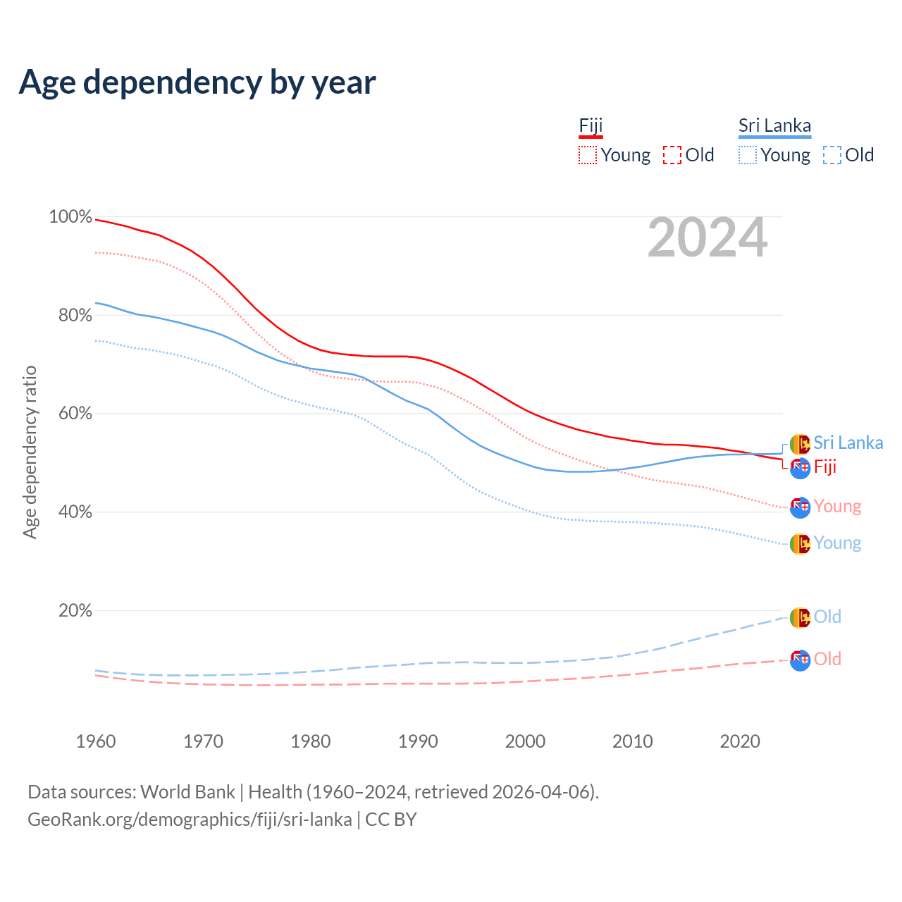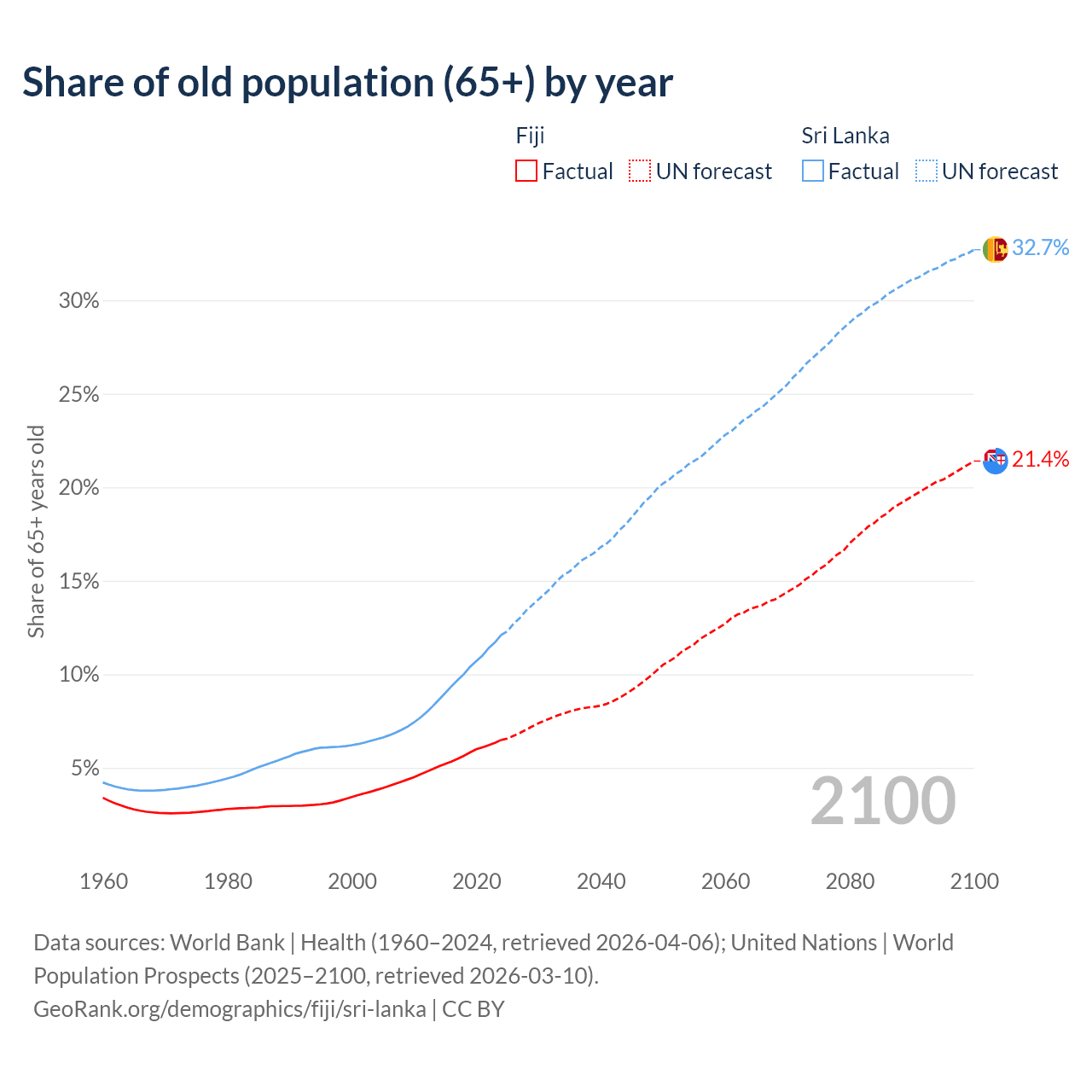 The share of older people aged 65 and over is 6.49% in Fiji and 12.1% in Sri Lanka. Life expectancy in Fiji compared to Sri Lanka .