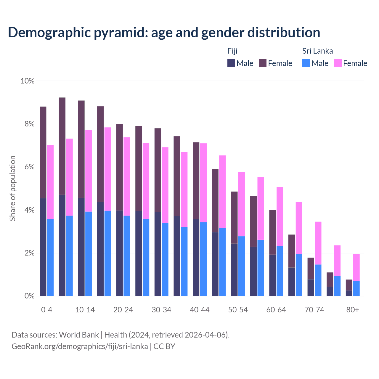 - Fiji is ranked 113/196 by median age (oldest to youngest) vs 81/196 for Sri Lanka.
