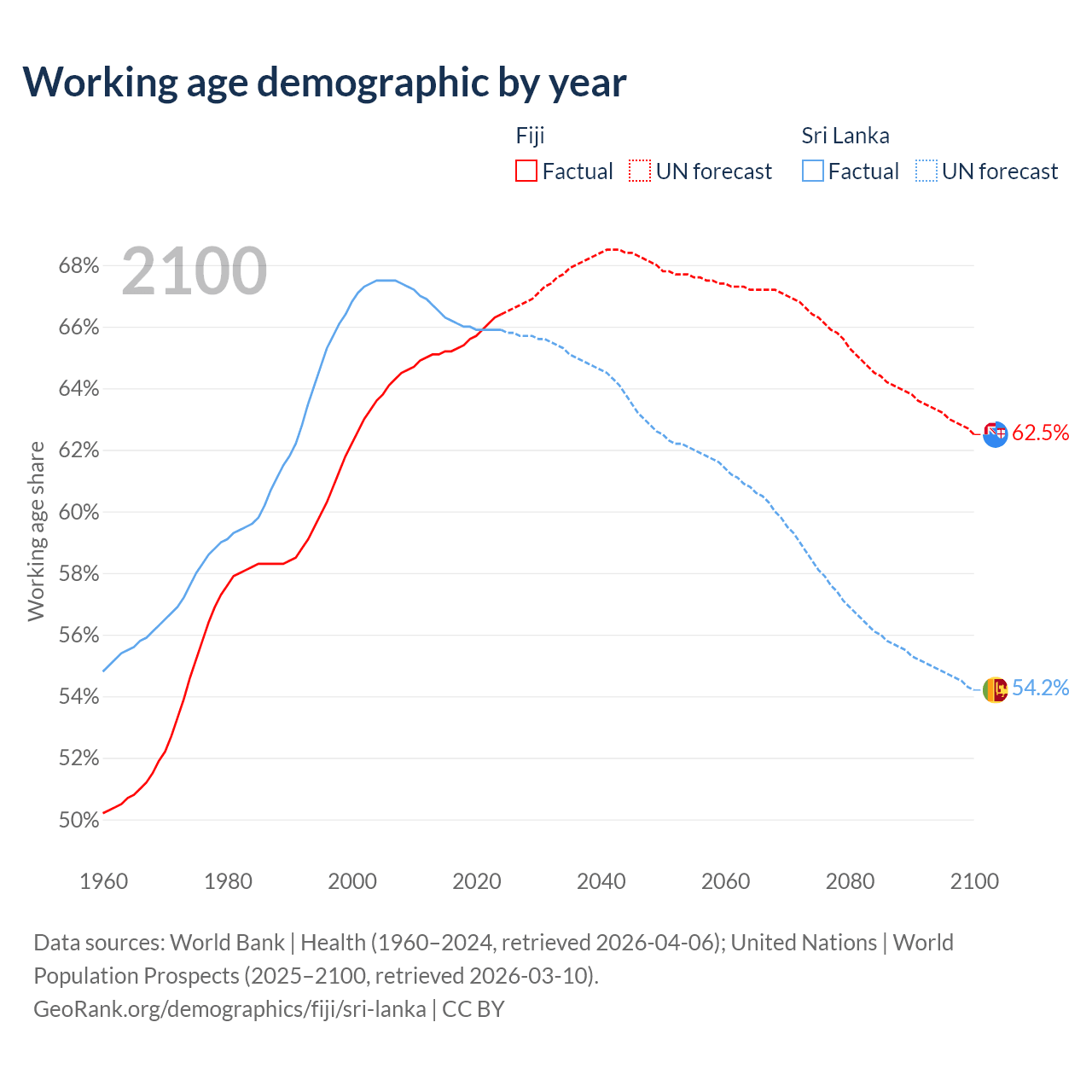 - Fiji has 623K working age adults (aged 15-64) vs 14.6M in Sri Lanka.