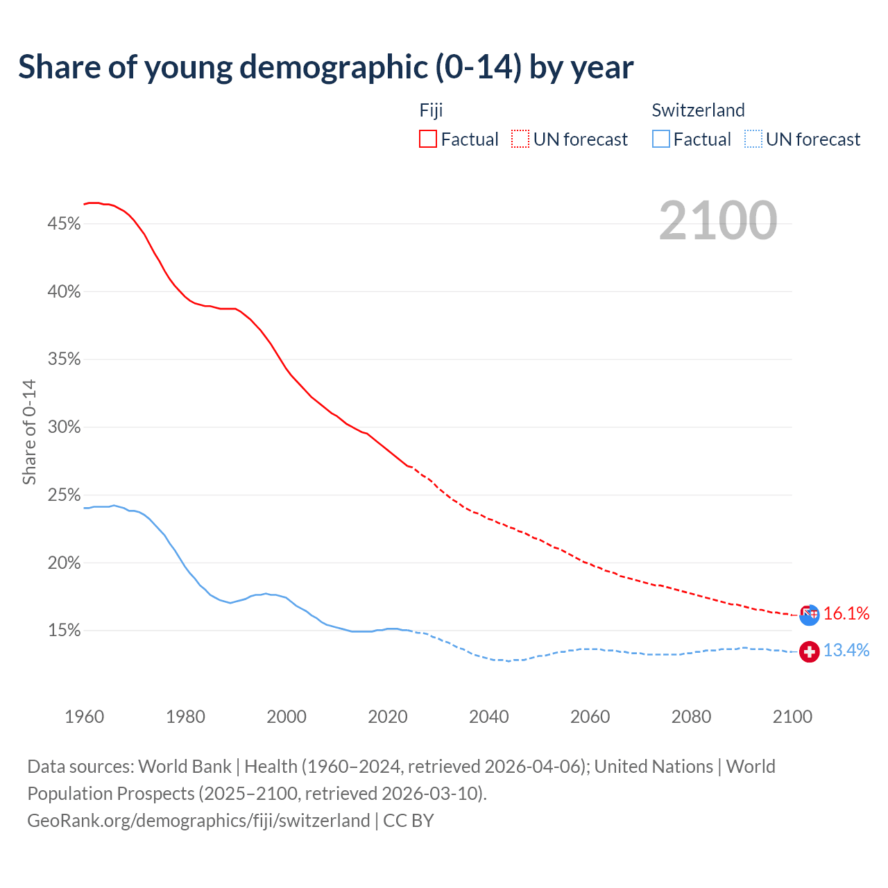 - The share of young demographic (0-15 years old) in Fiji is 27.1% vs 15% in Switzerland.