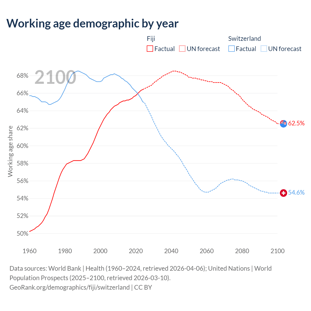 Median age Fiji vs Switzerland, 1960-2100