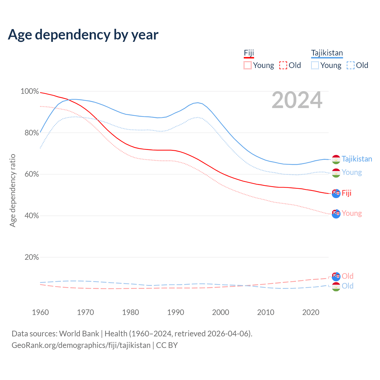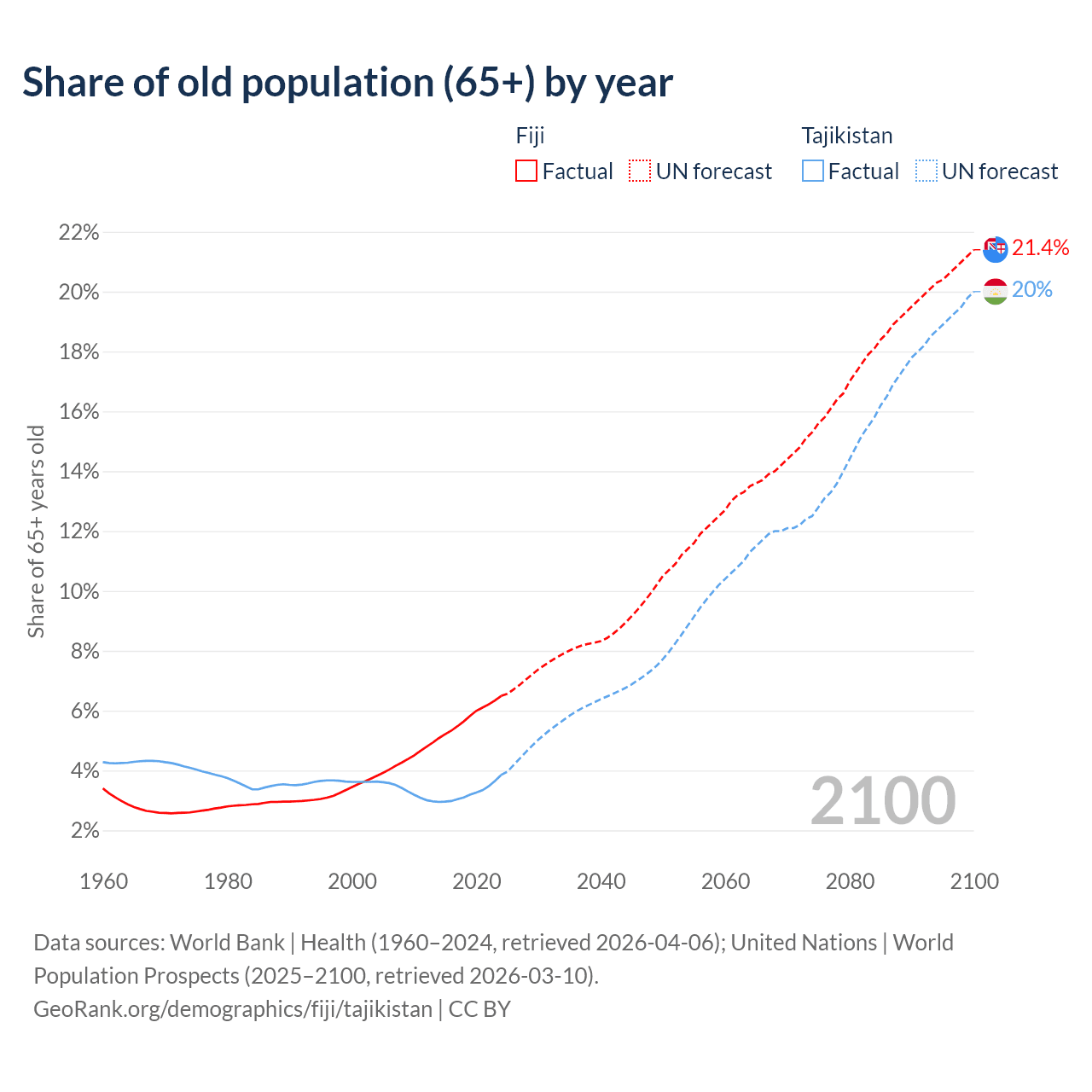 - The share of old-age demographic (65+) in Fiji is 6.49% vs 3.85% in Tajikistan.