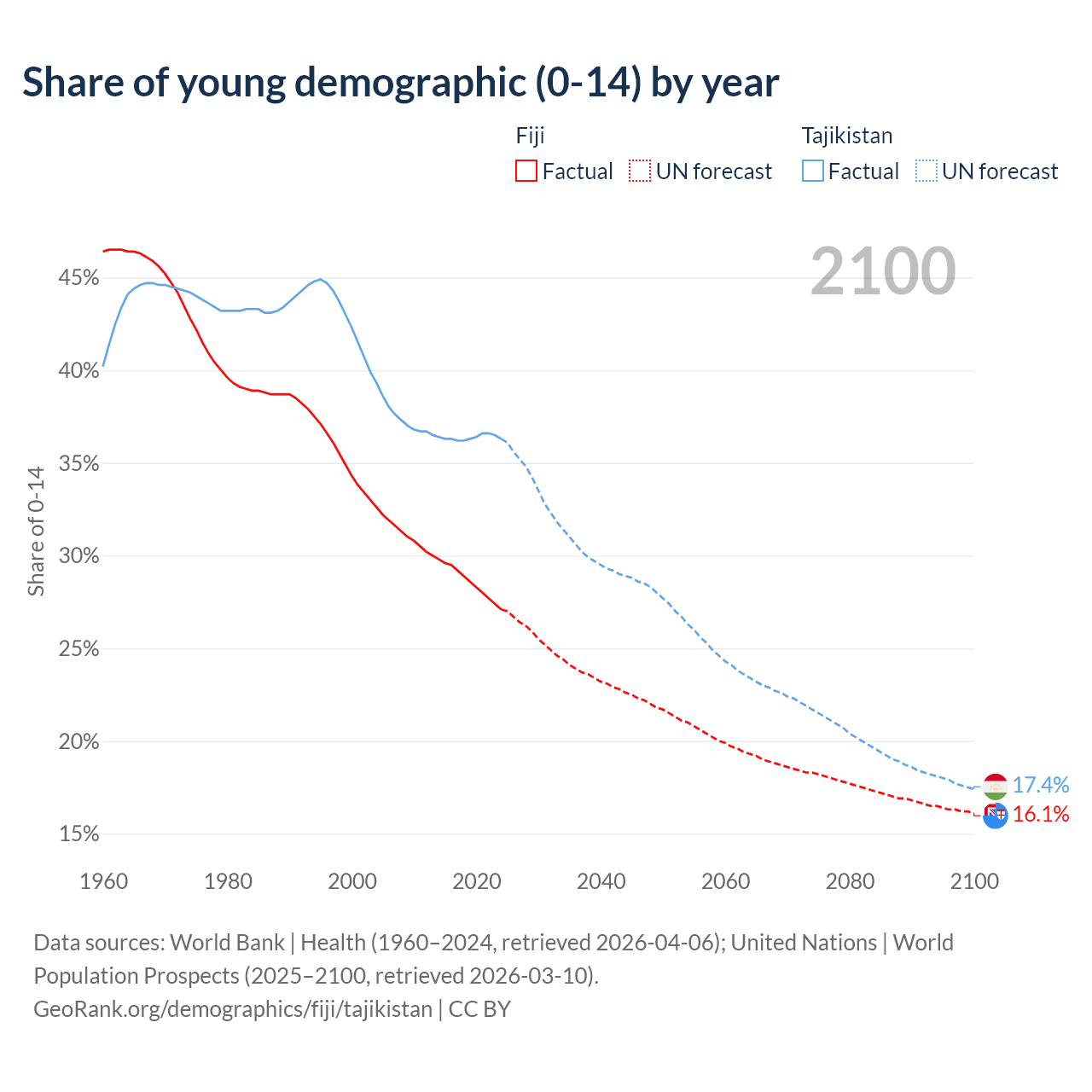 - The share of young demographic (0-15 years old) in Fiji is 27.1% vs 36.3% in Tajikistan.