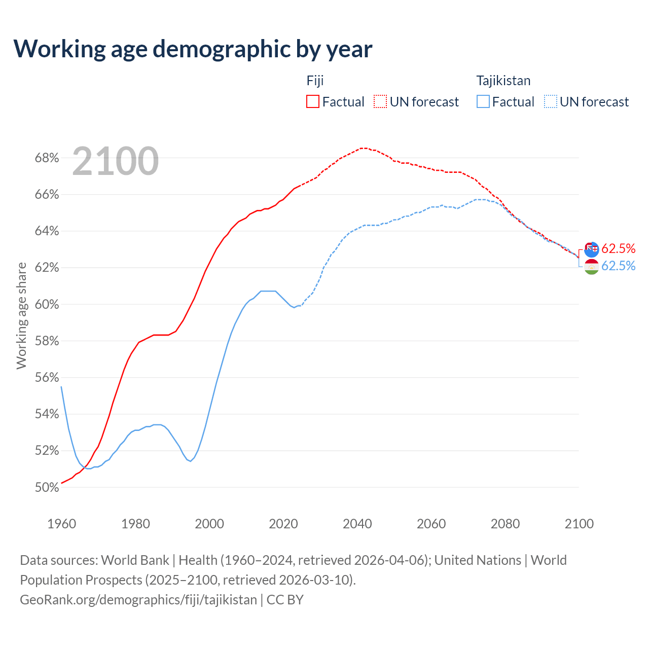 - Fiji has 623K working age adults (aged 15-64) vs 6.61M in Tajikistan.