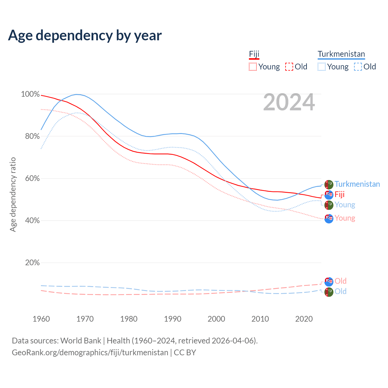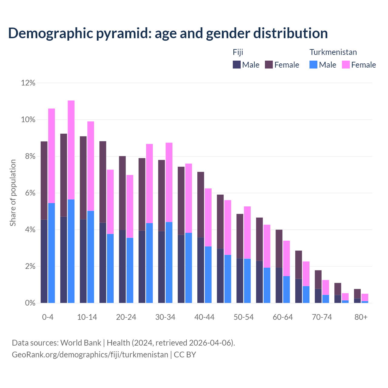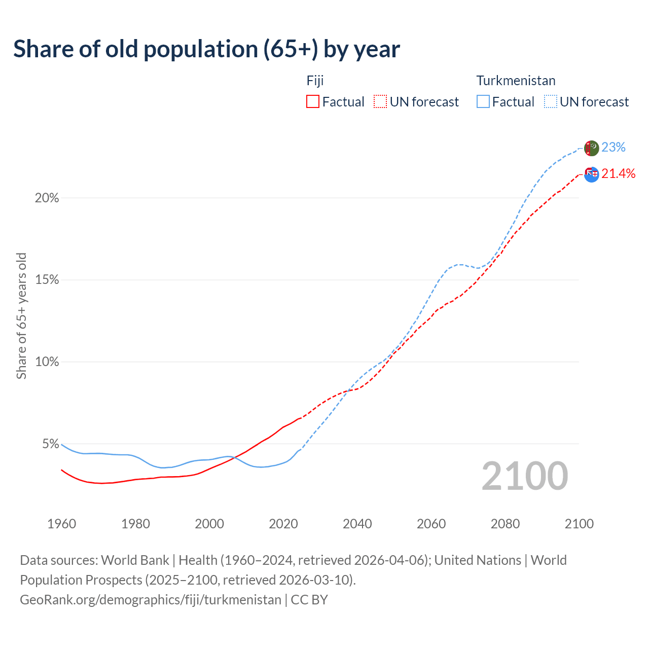 - The share of old-age demographic (65+) in Fiji is 6.49% vs 4.53% in Turkmenistan.