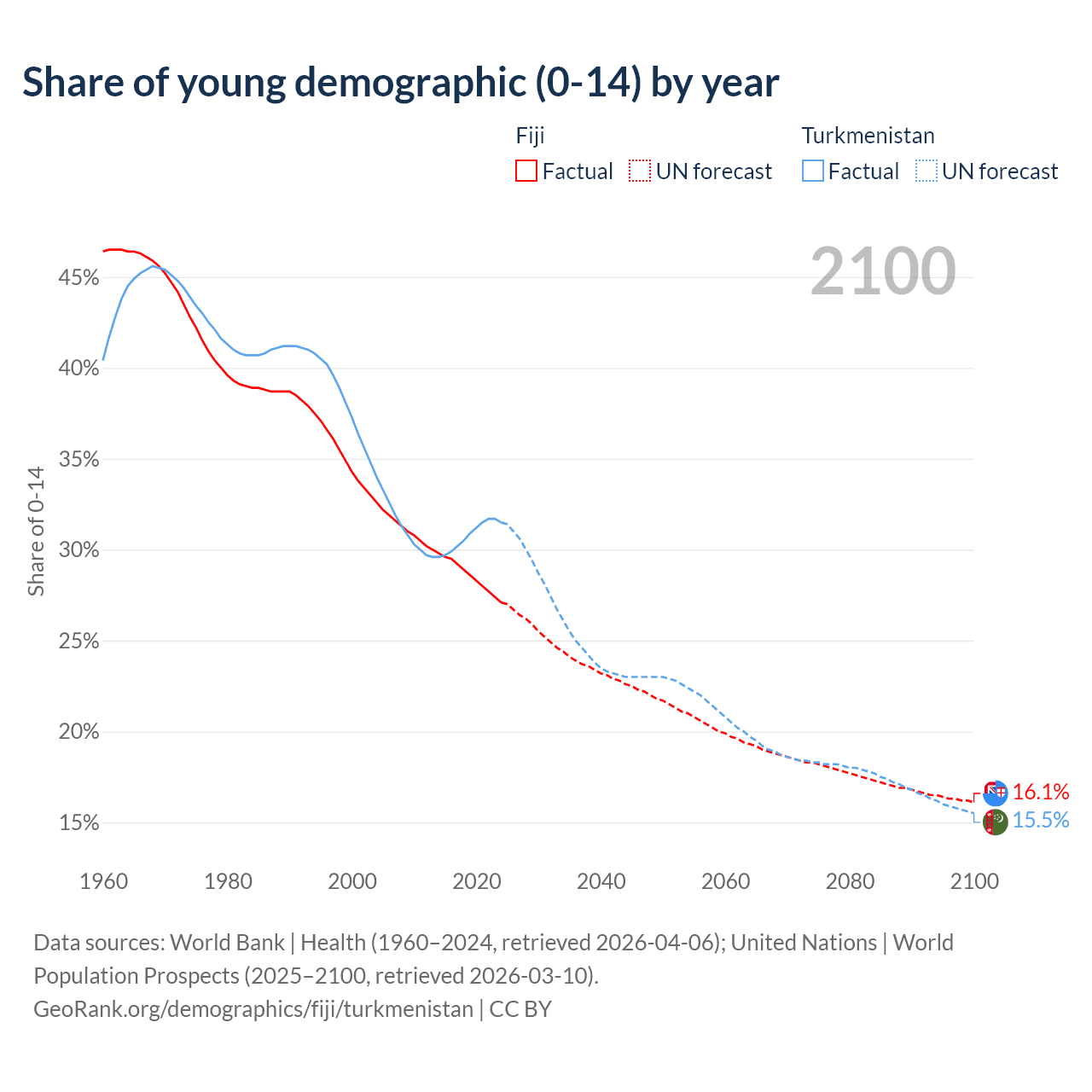 - The share of young demographic (0-15 years old) in Fiji is 27.1% vs 31.5% in Turkmenistan.