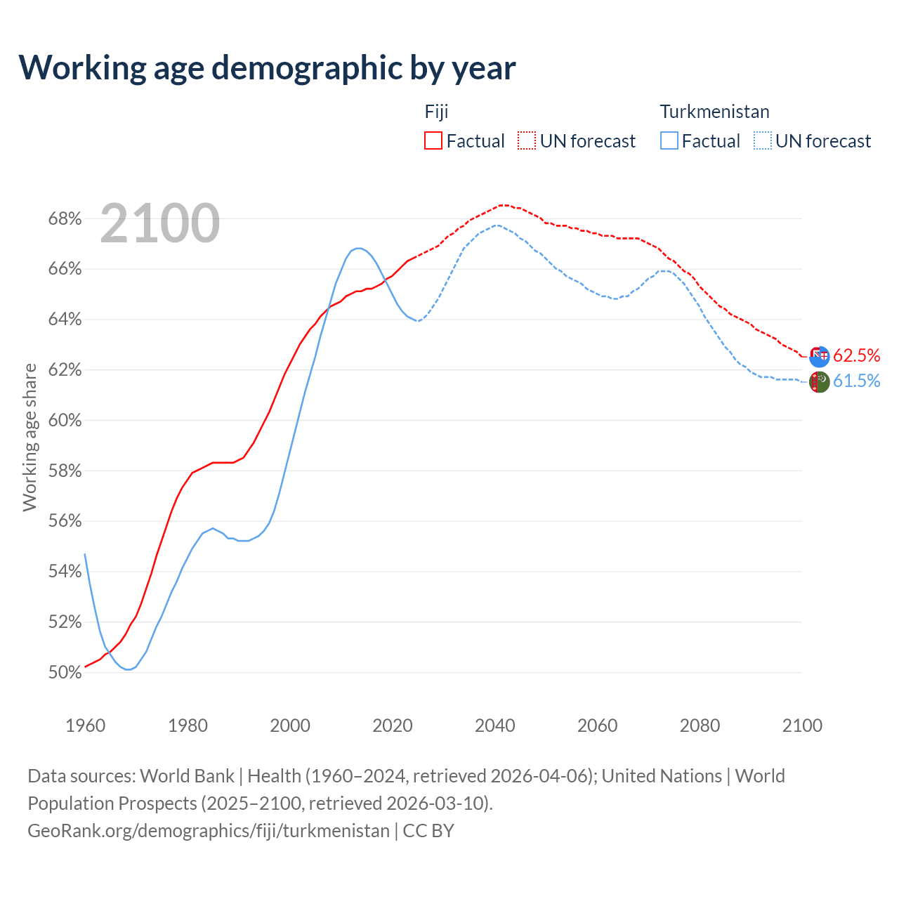 - Fiji has 623K working age adults (aged 15-64) vs 4.97M in Turkmenistan.
