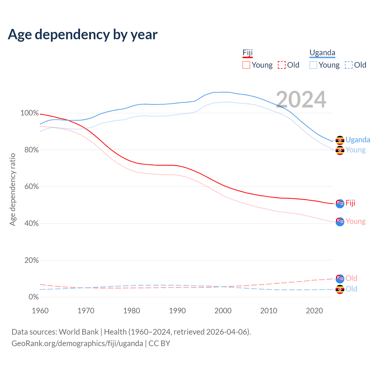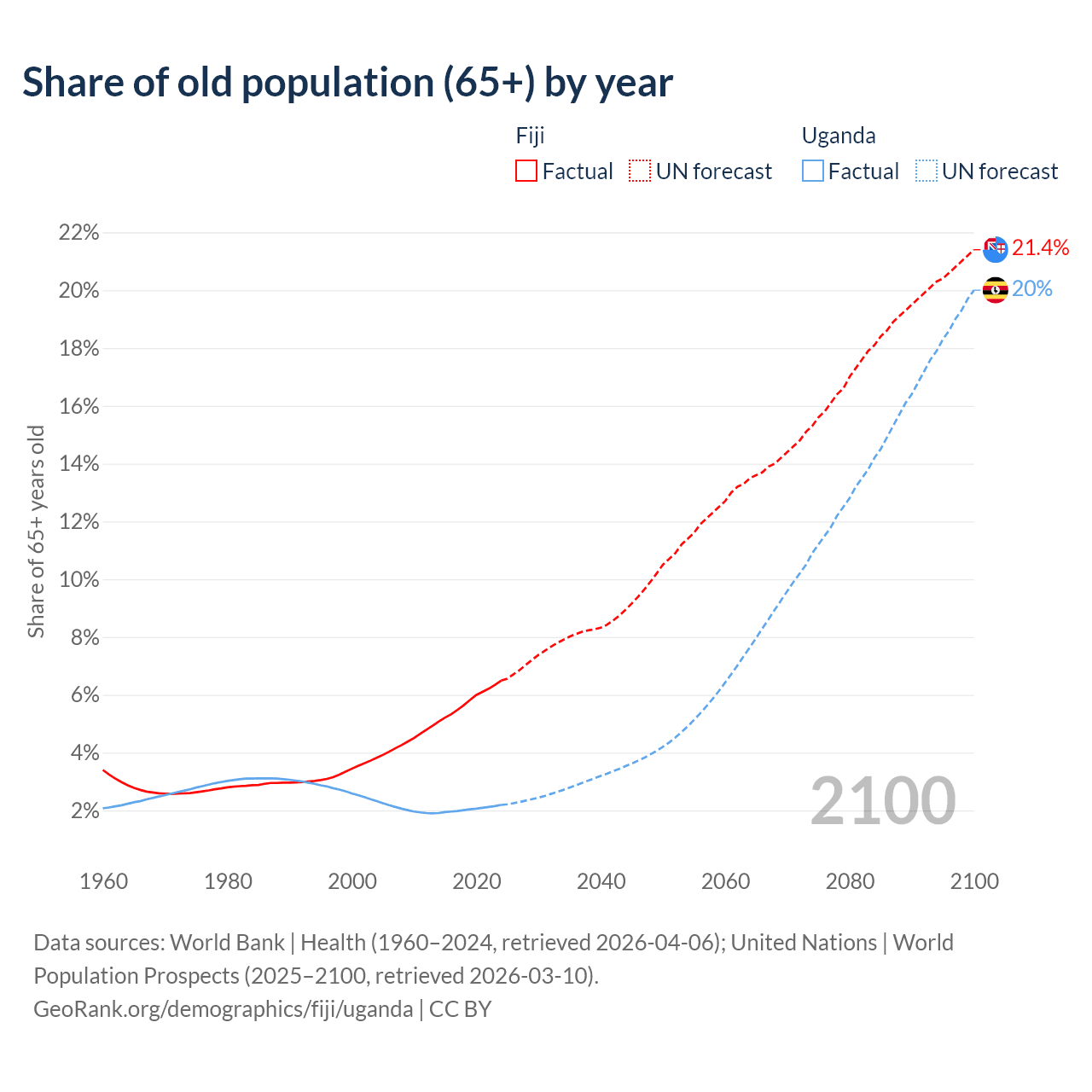 - The share of old-age demographic (65+) in Fiji is 6.49% vs 2.19% in Uganda.