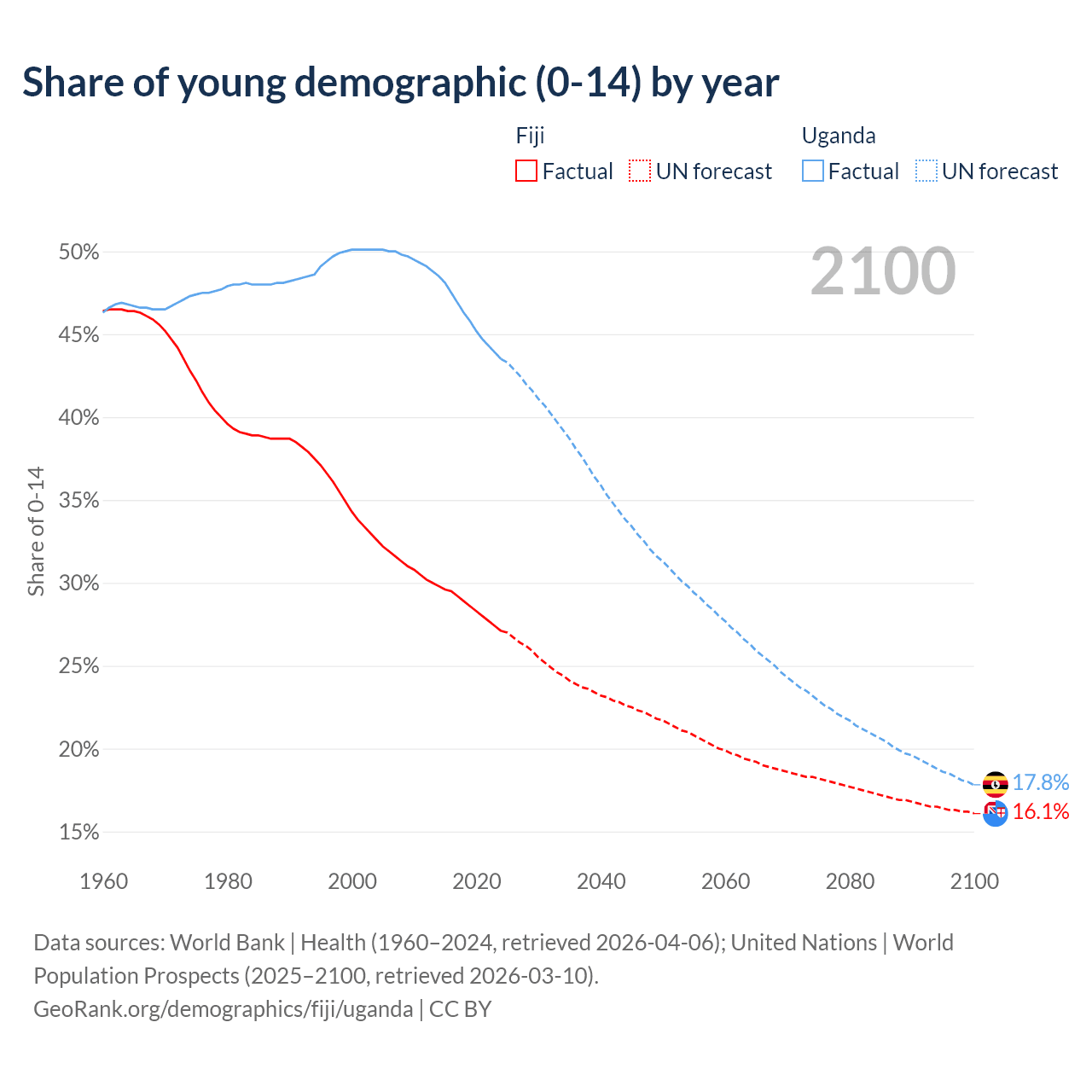 - The share of young demographic (0-15 years old) in Fiji is 27.1% vs 43.5% in Uganda.