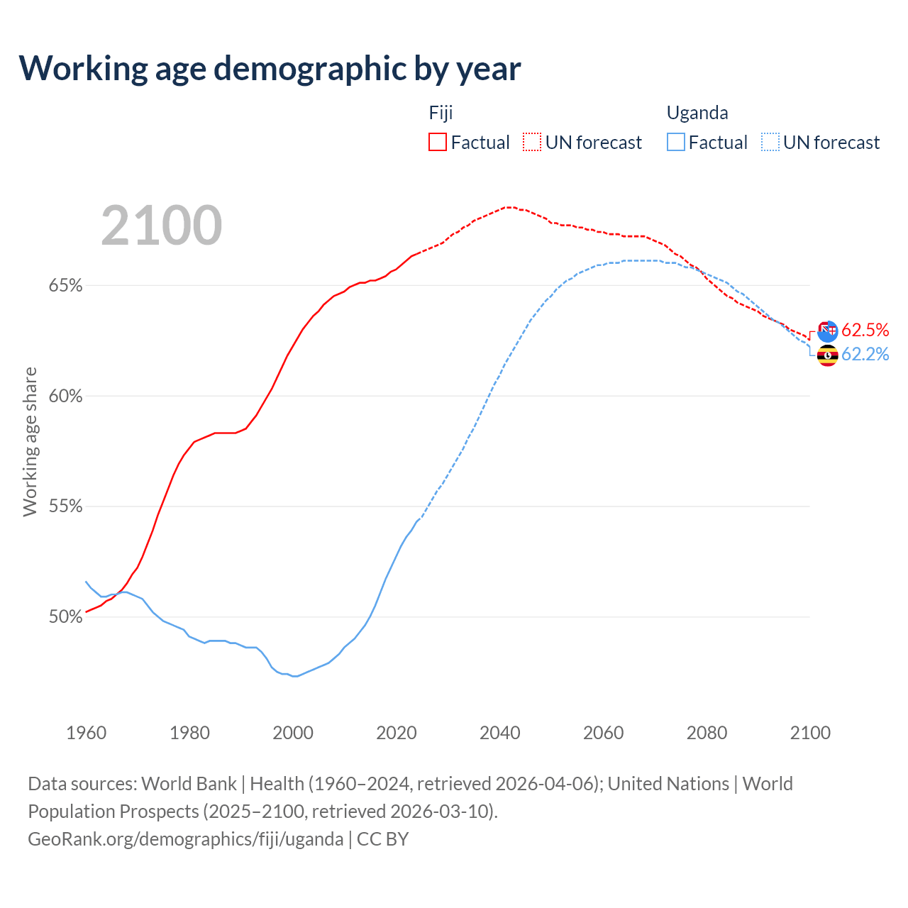 The share of older people aged 65 and over is 6.49% in Fiji and 2.19% in Uganda. Life expectancy in Fiji compared to Uganda .