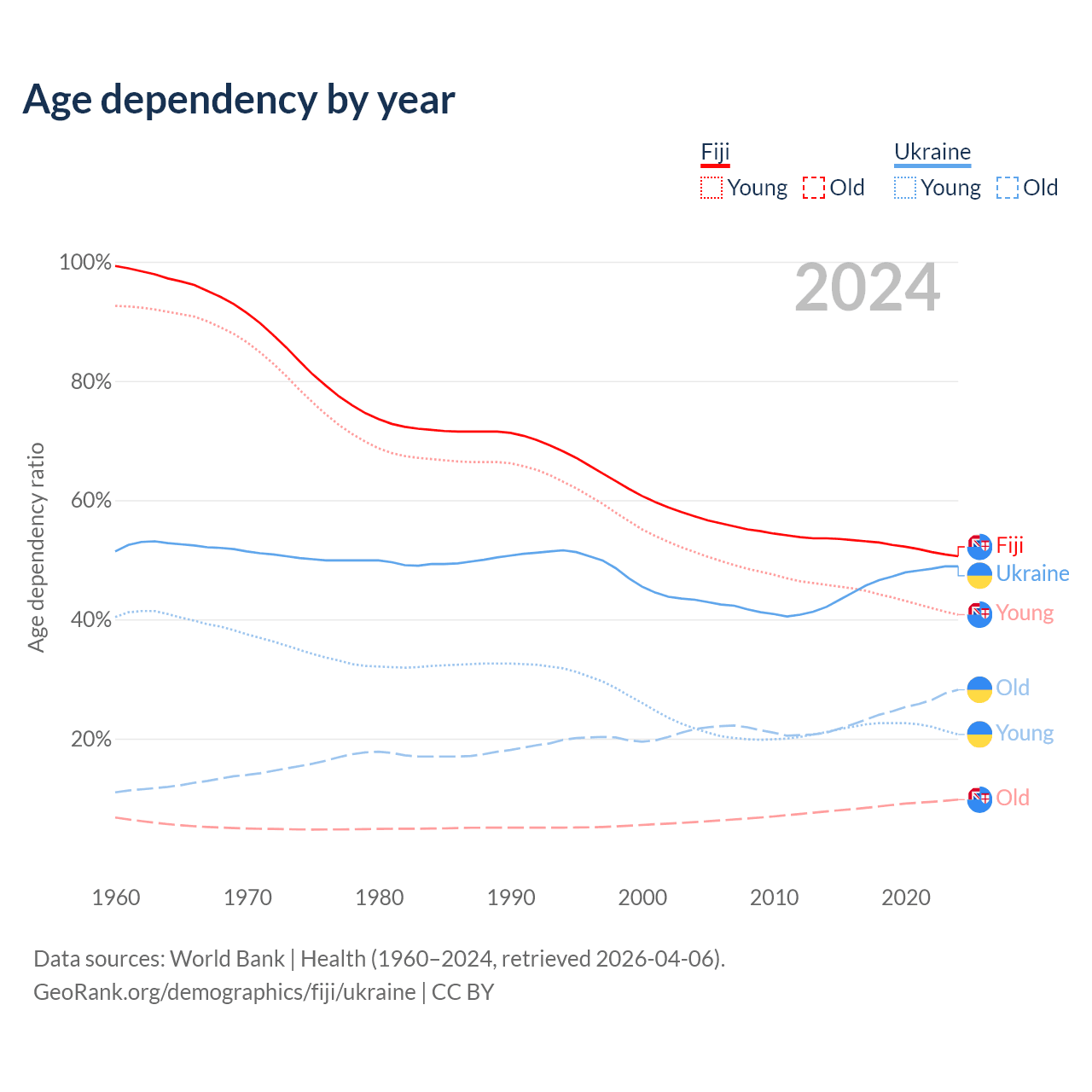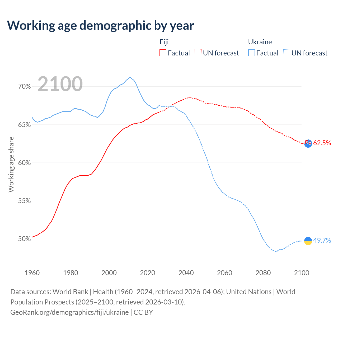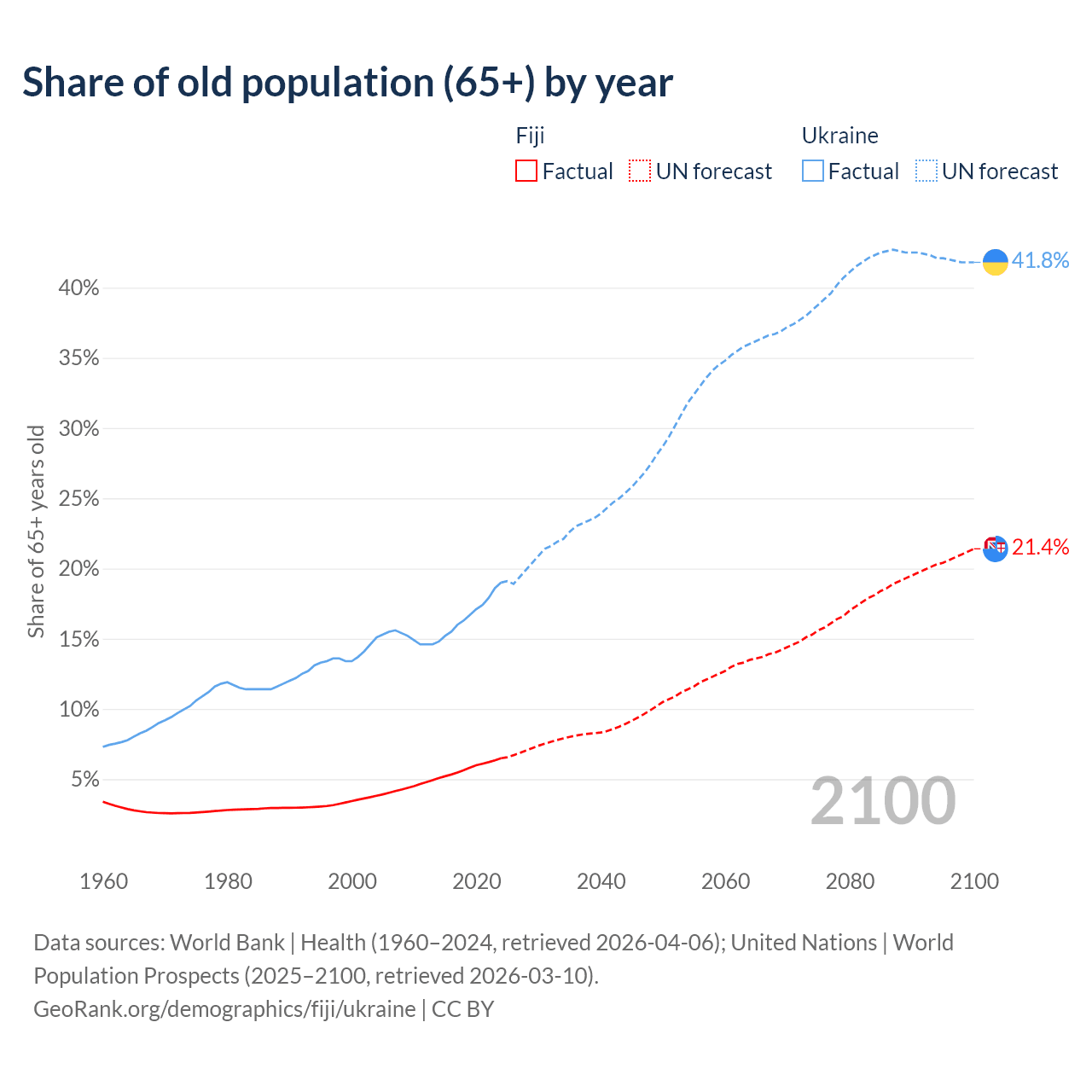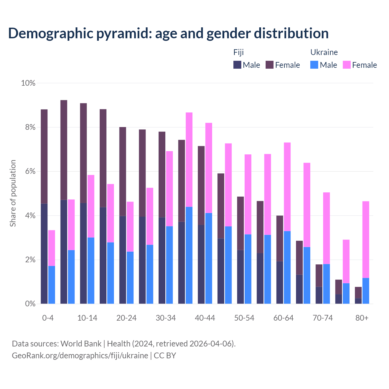 - The share of old-age demographic (65+) in Fiji is 6.49% vs 19% in Ukraine.