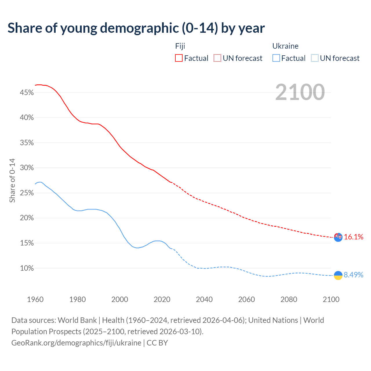 - The share of young demographic (0-15 years old) in Fiji is 27.1% vs 13.9% in Ukraine.