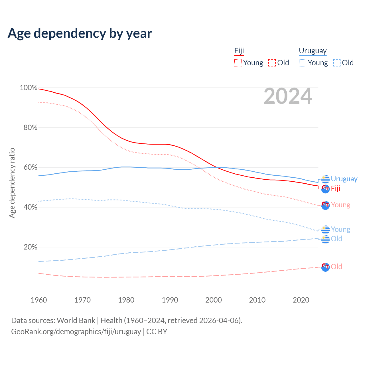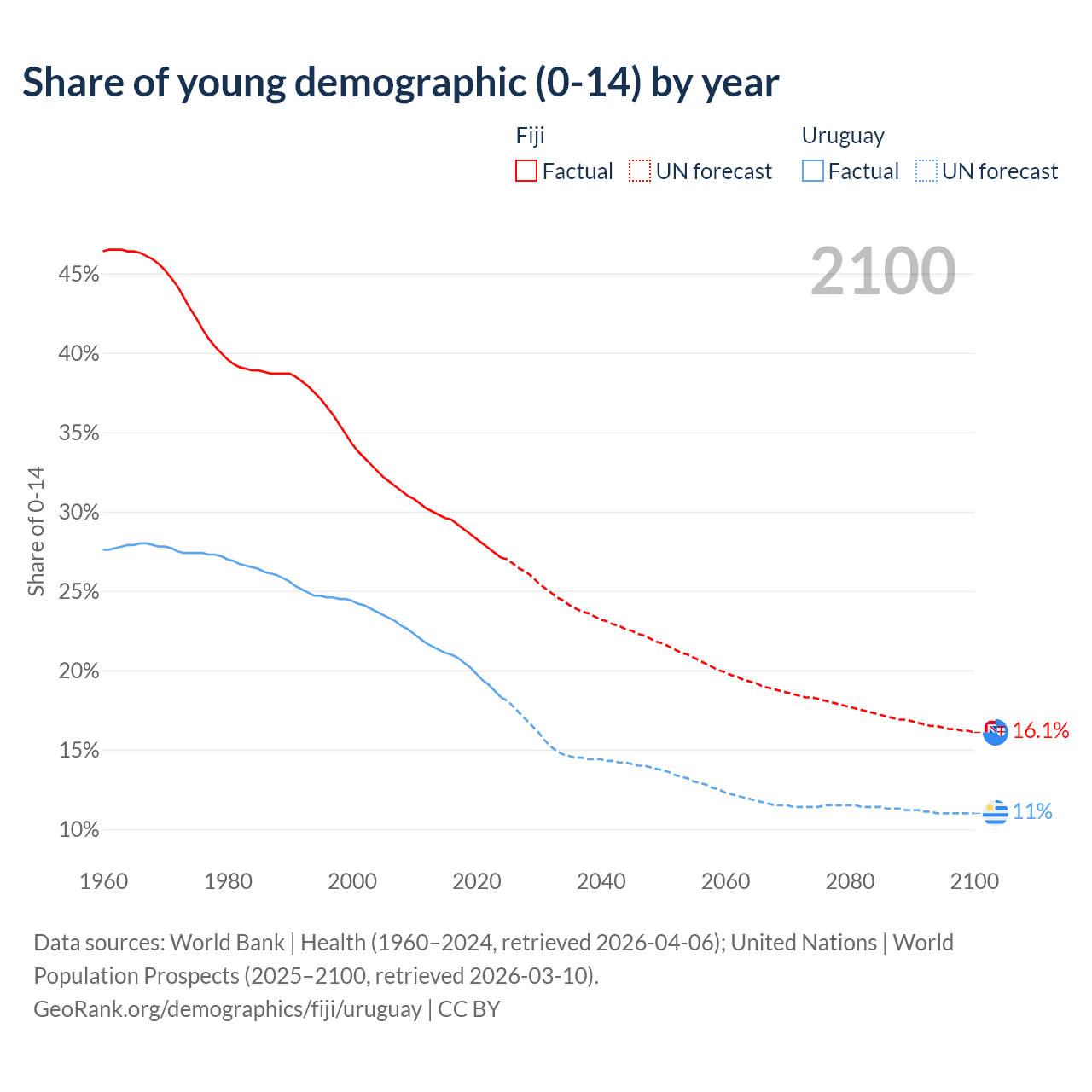 - The share of young demographic (0-15 years old) in Fiji is 27.1% vs 18.3% in Uruguay.