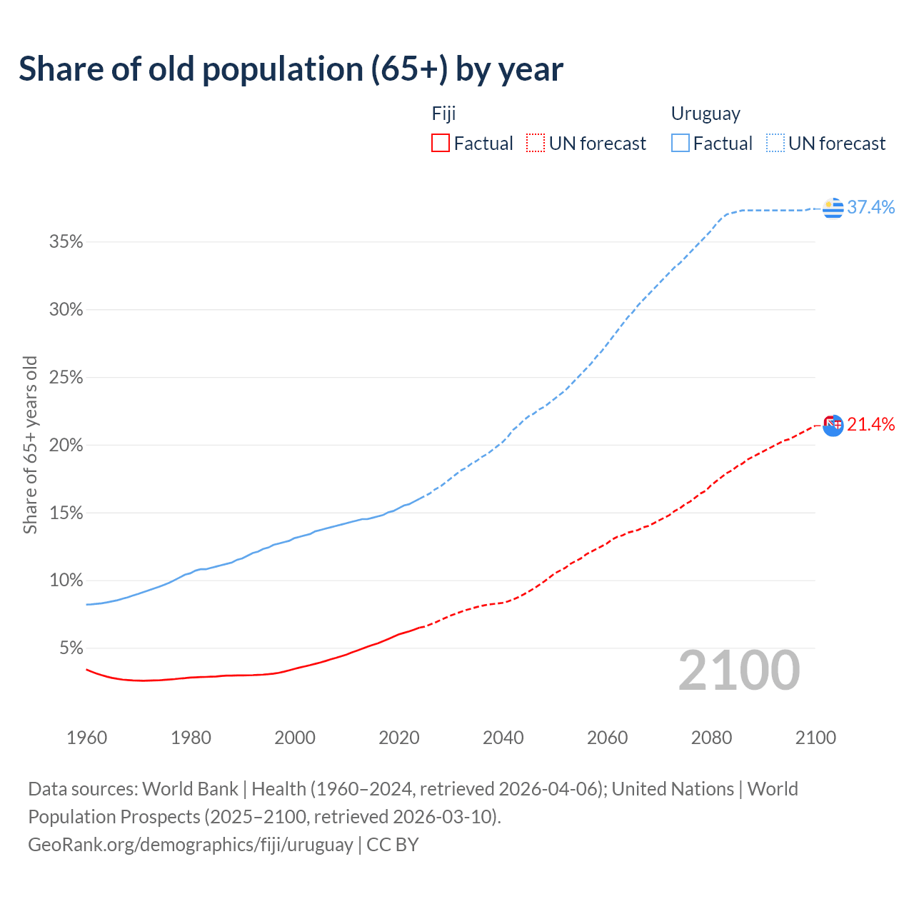 - The share of old-age demographic (65+) in Fiji is 6.49% vs 16% in Uruguay.