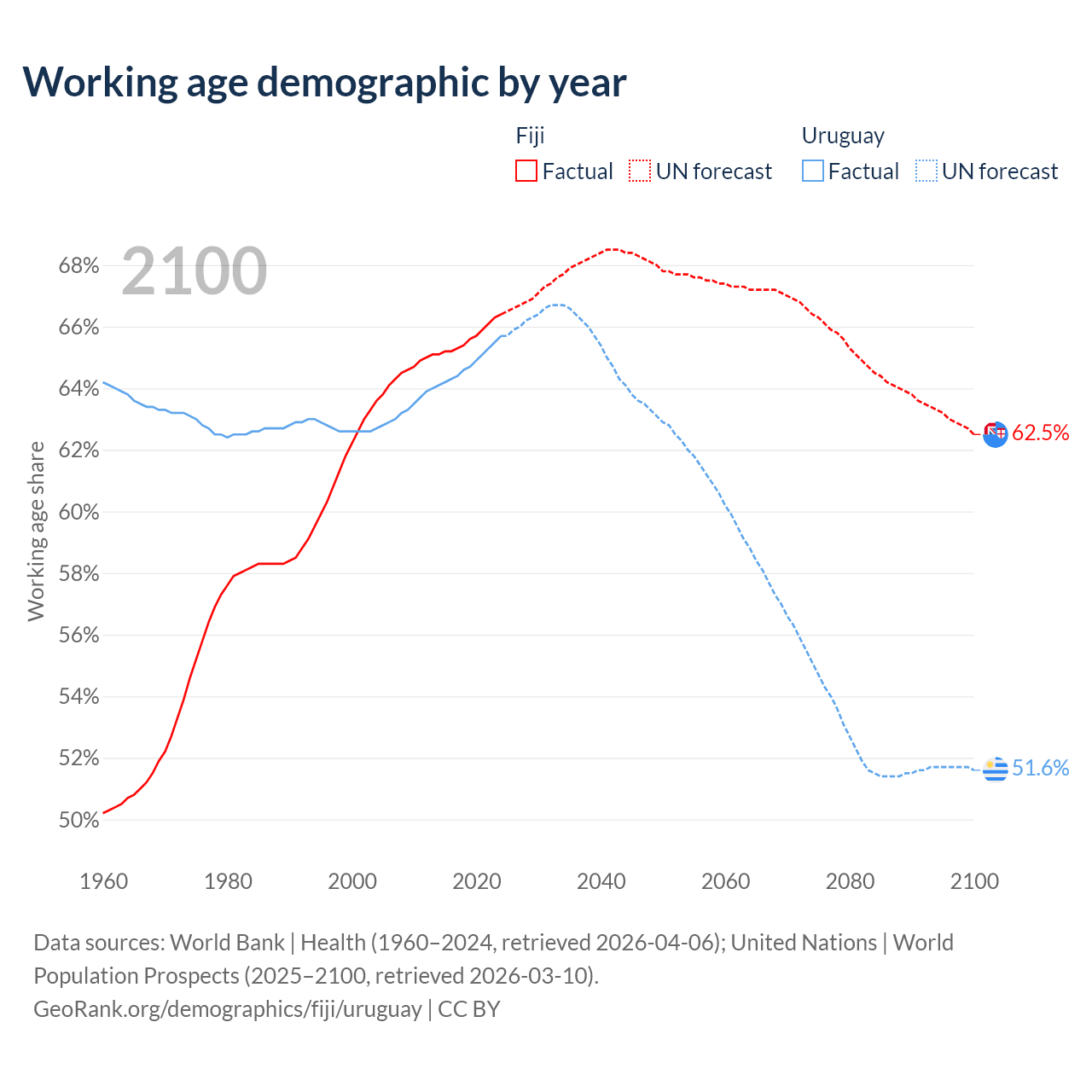- Fiji has 623K working age adults (aged 15-64) vs 2.22M in Uruguay.