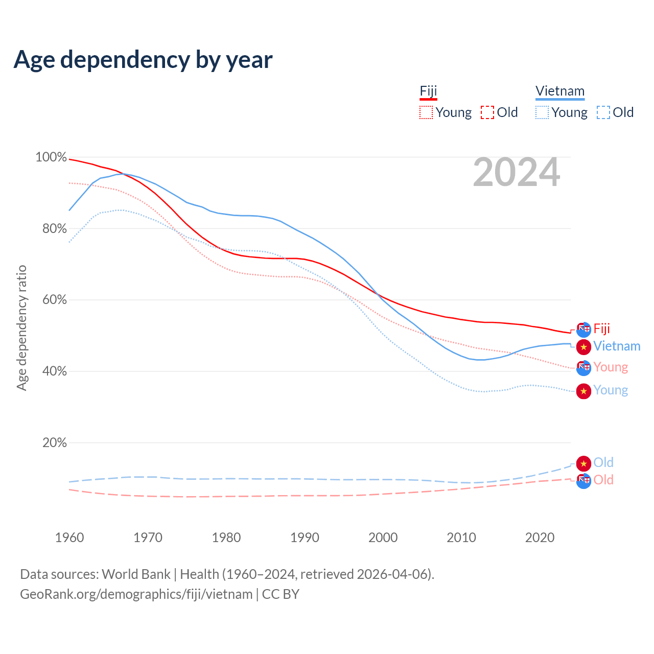 Data sources: World Bank | Health (1960–2024, retrieved 2026-04-06); U.S. Census Bureau (1960–2024, retrieved 2026-02-08).