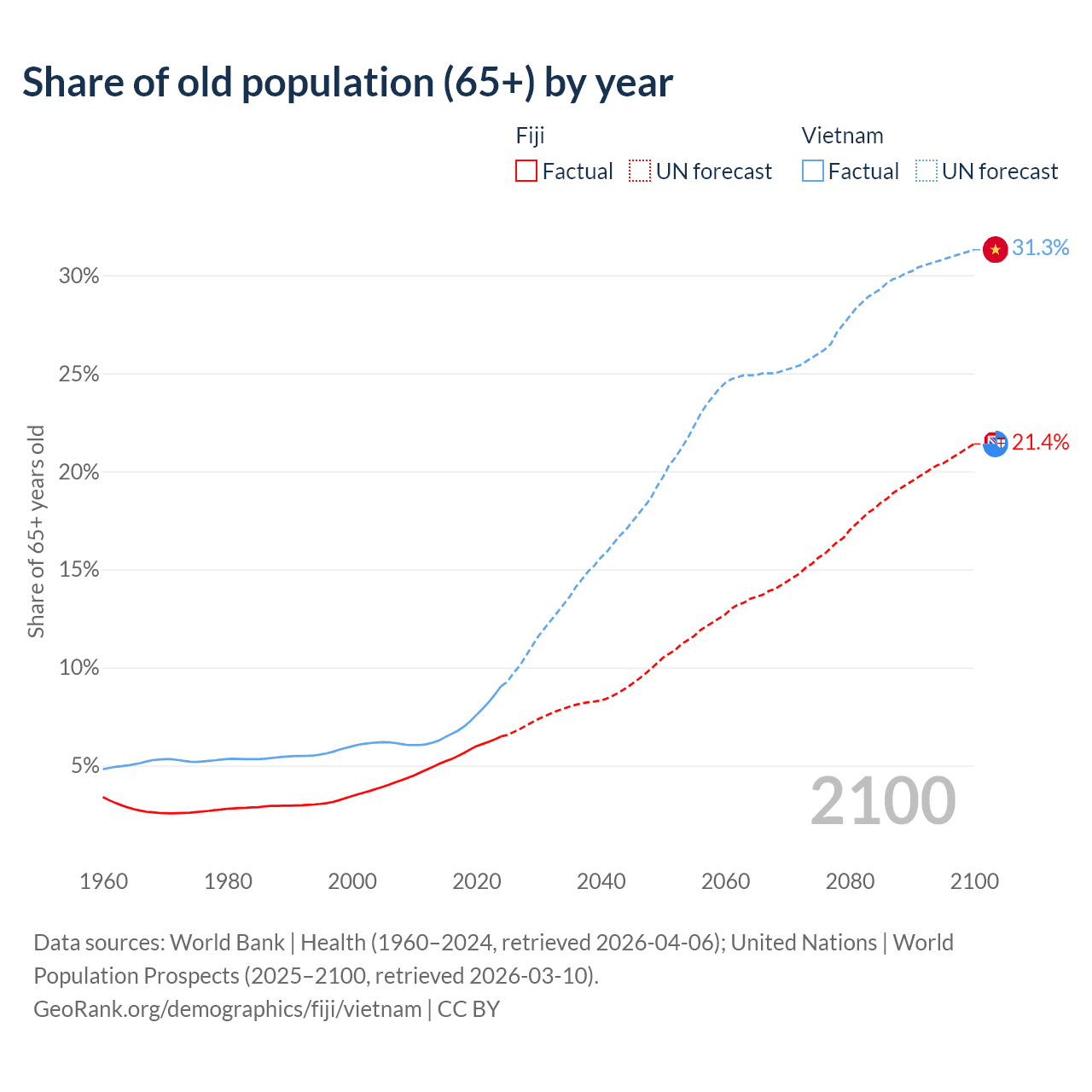 The share of older people aged 65 and over is 6.49% in Fiji and 9.05% in Vietnam. Life expectancy in Fiji compared to Vietnam .
