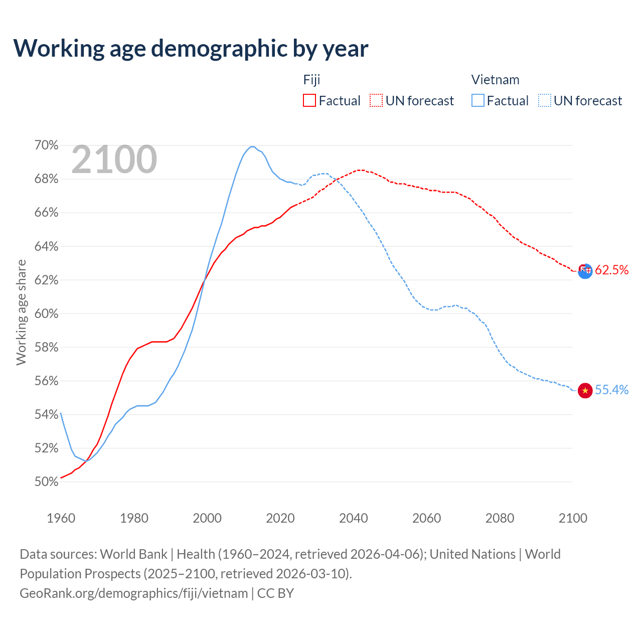 - Fiji has 623K working age adults (aged 15-64) vs 69.3M in Vietnam.