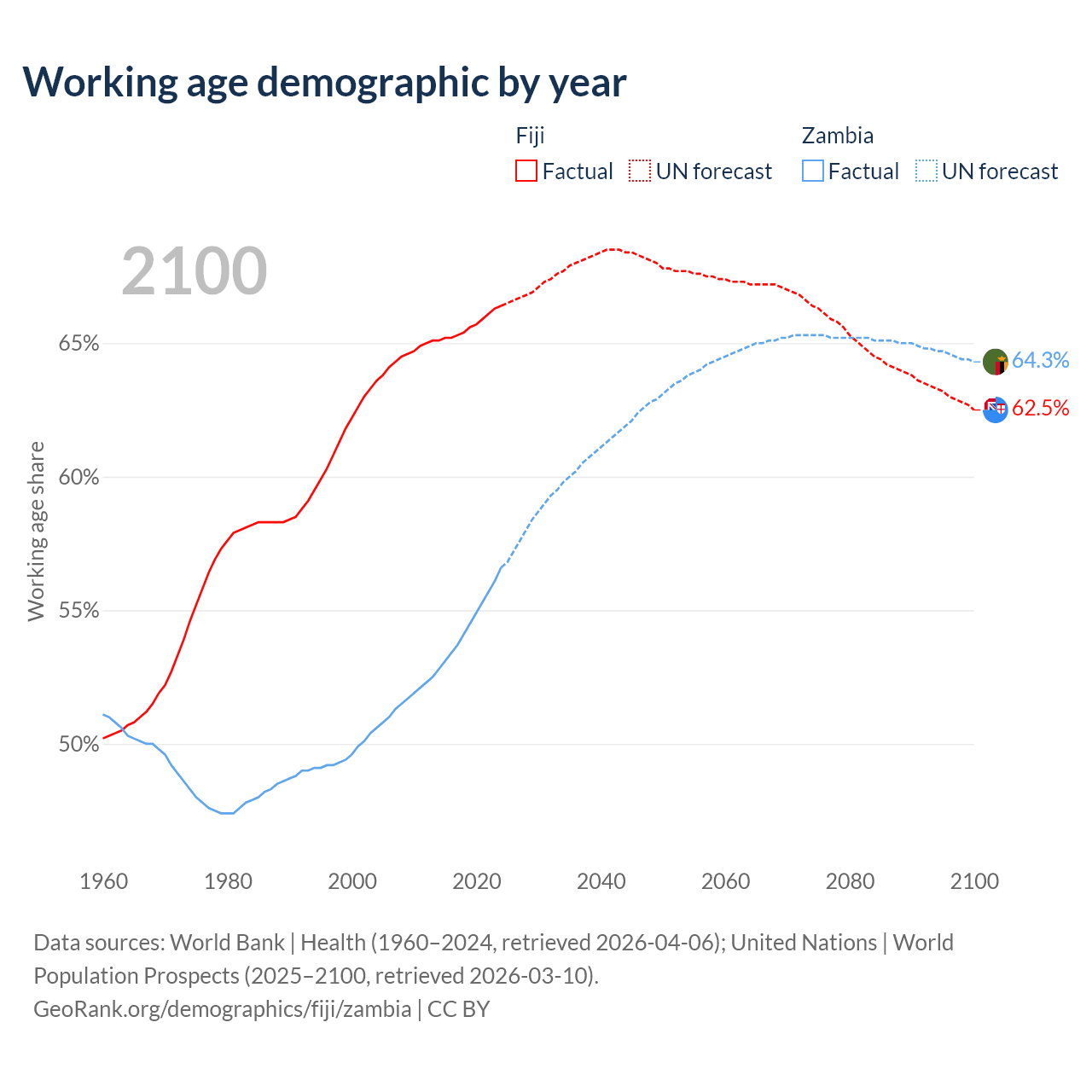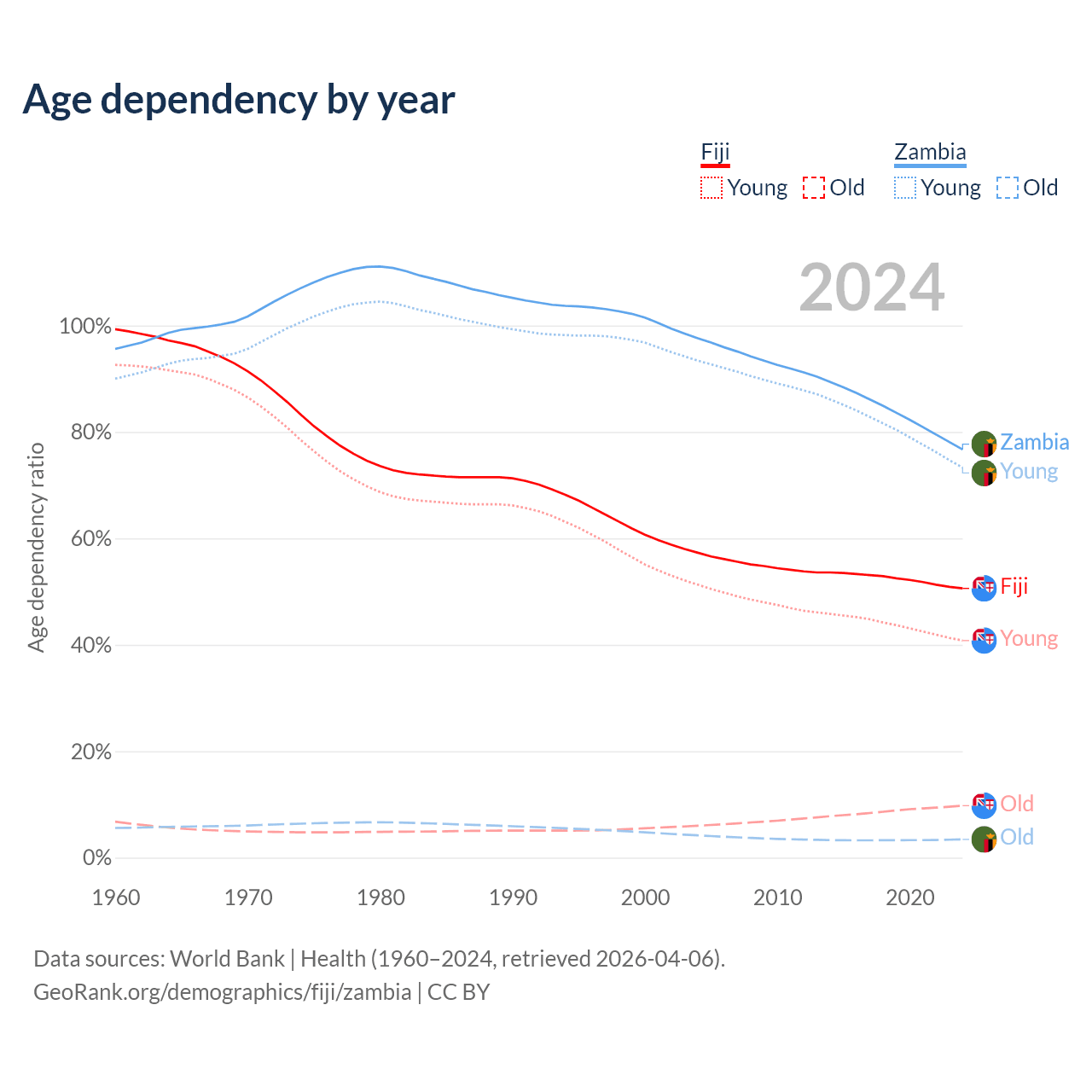 - The share of old-age demographic (65+) in Fiji is 6.49% vs 1.95% in Zambia.