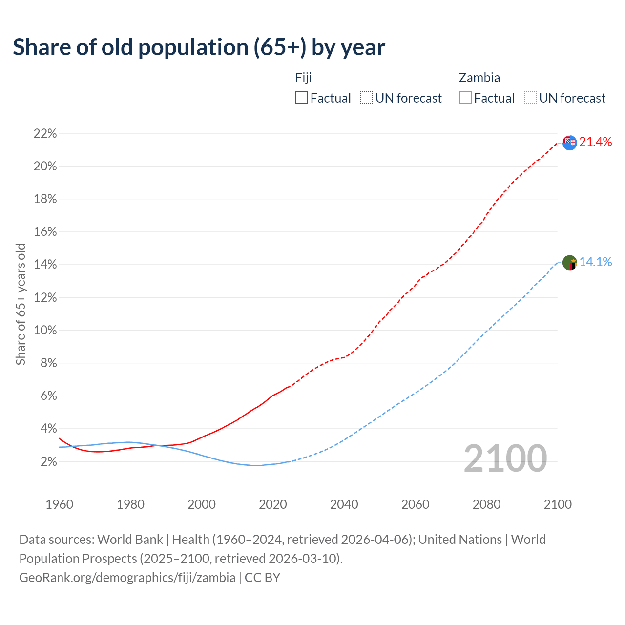The share of older people aged 65 and over is 6.49% in Fiji and 1.95% in Zambia. Life expectancy in Fiji compared to Zambia .