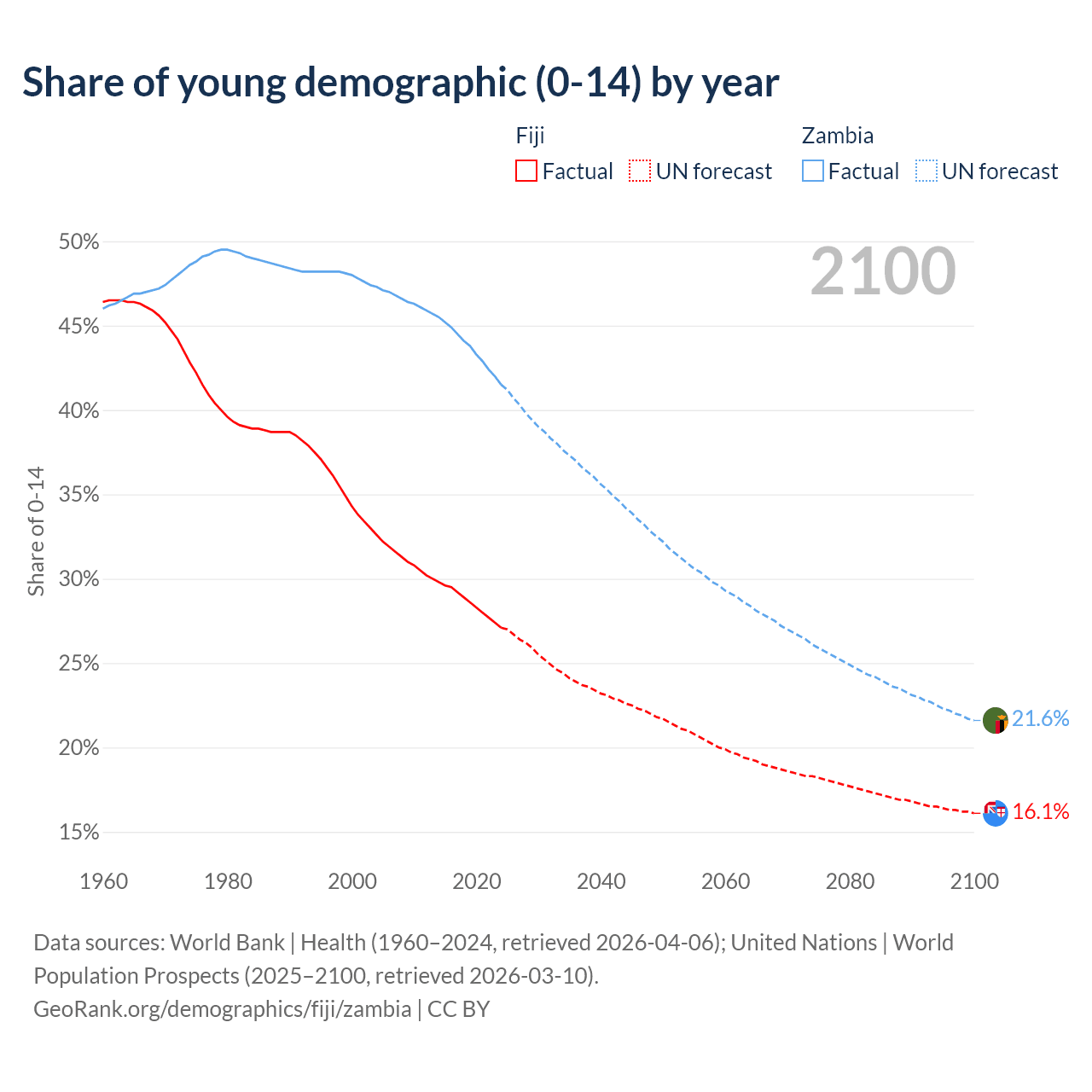 - The share of young demographic (0-15 years old) in Fiji is 27.1% vs 41.5% in Zambia.