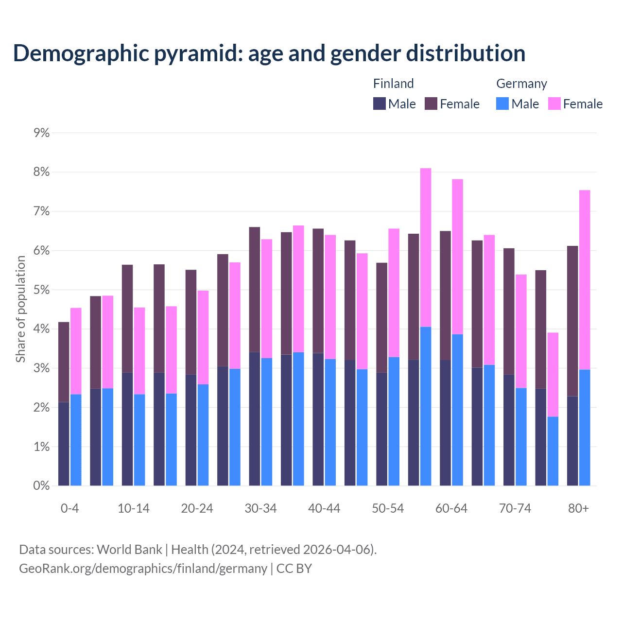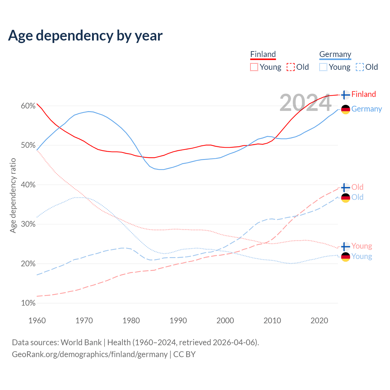 - Finland is ranked 22/196 by median age (oldest to youngest) vs 9/196 for Germany.