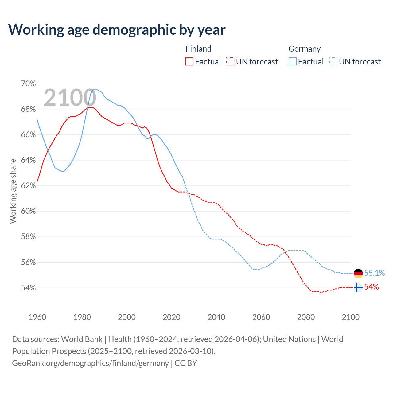 - Finland has 3.46M working age adults (aged 15-64) vs 51.9M in Germany.