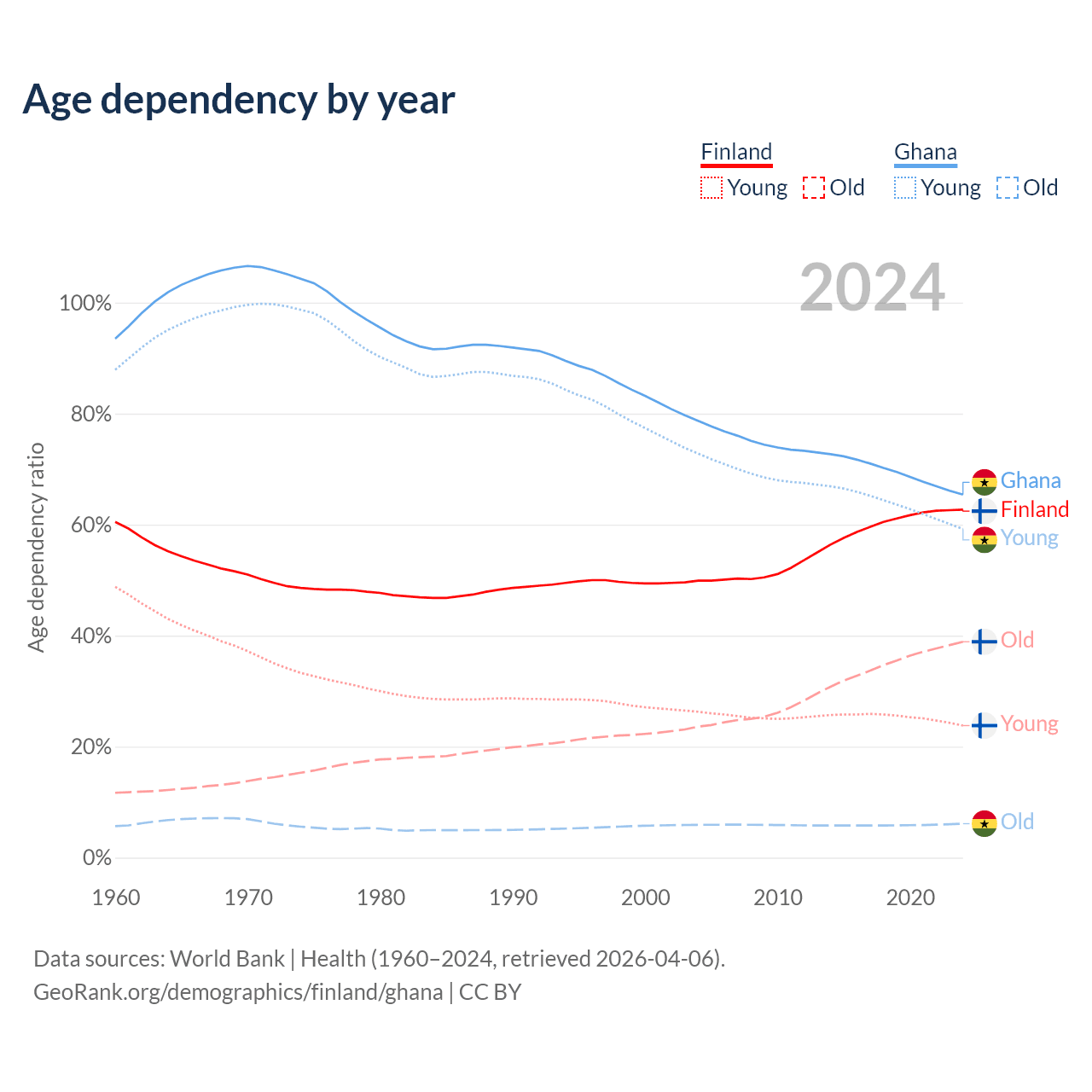- The share of old-age demographic (65+) in Finland is 23.9% vs 3.71% in Ghana.