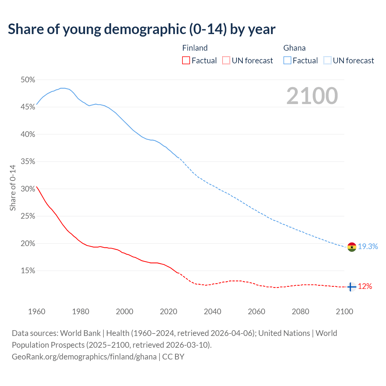 - The share of young demographic (0-15 years old) in Finland is 14.6% vs 35.8% in Ghana.