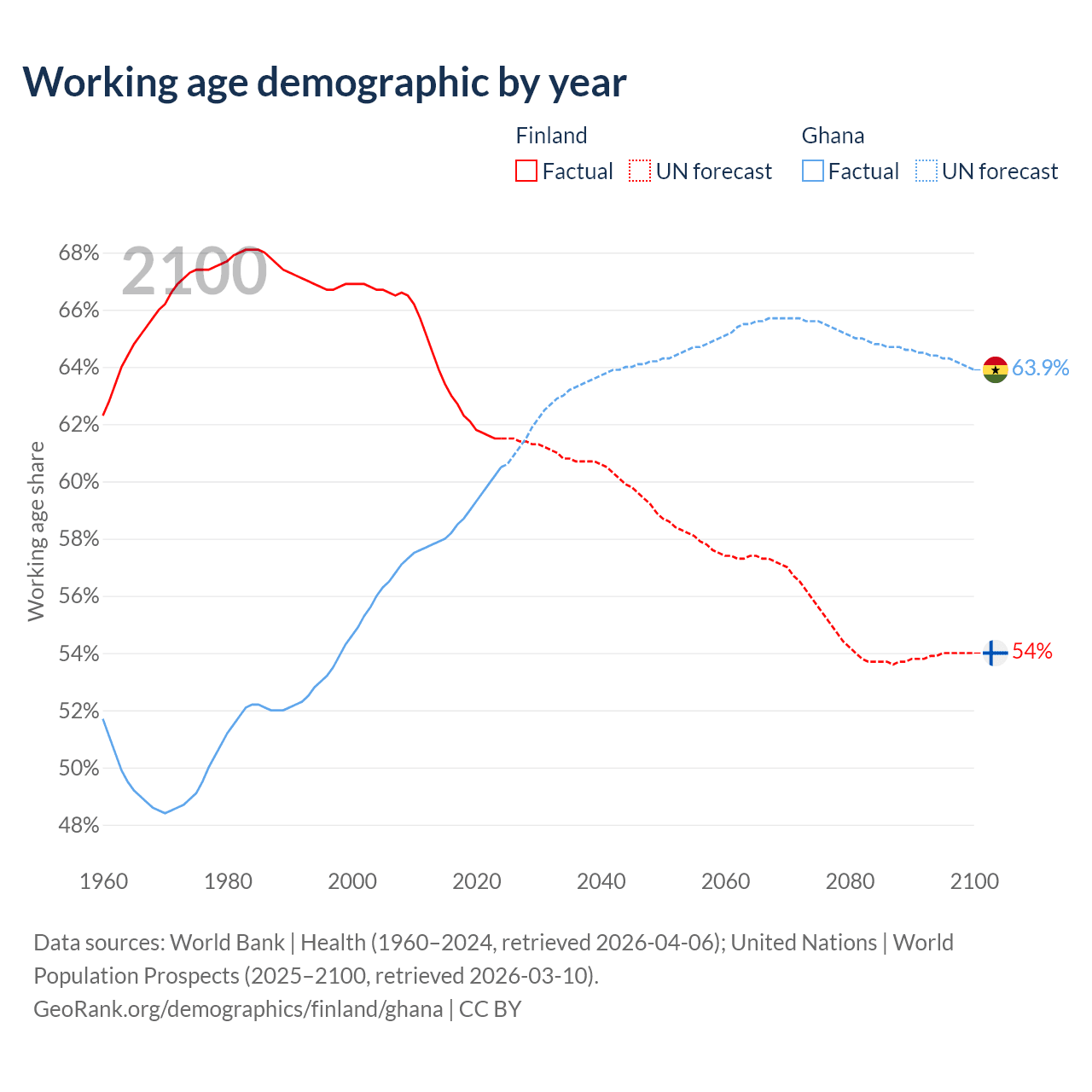 Median age Finland vs Ghana, 1960-2100