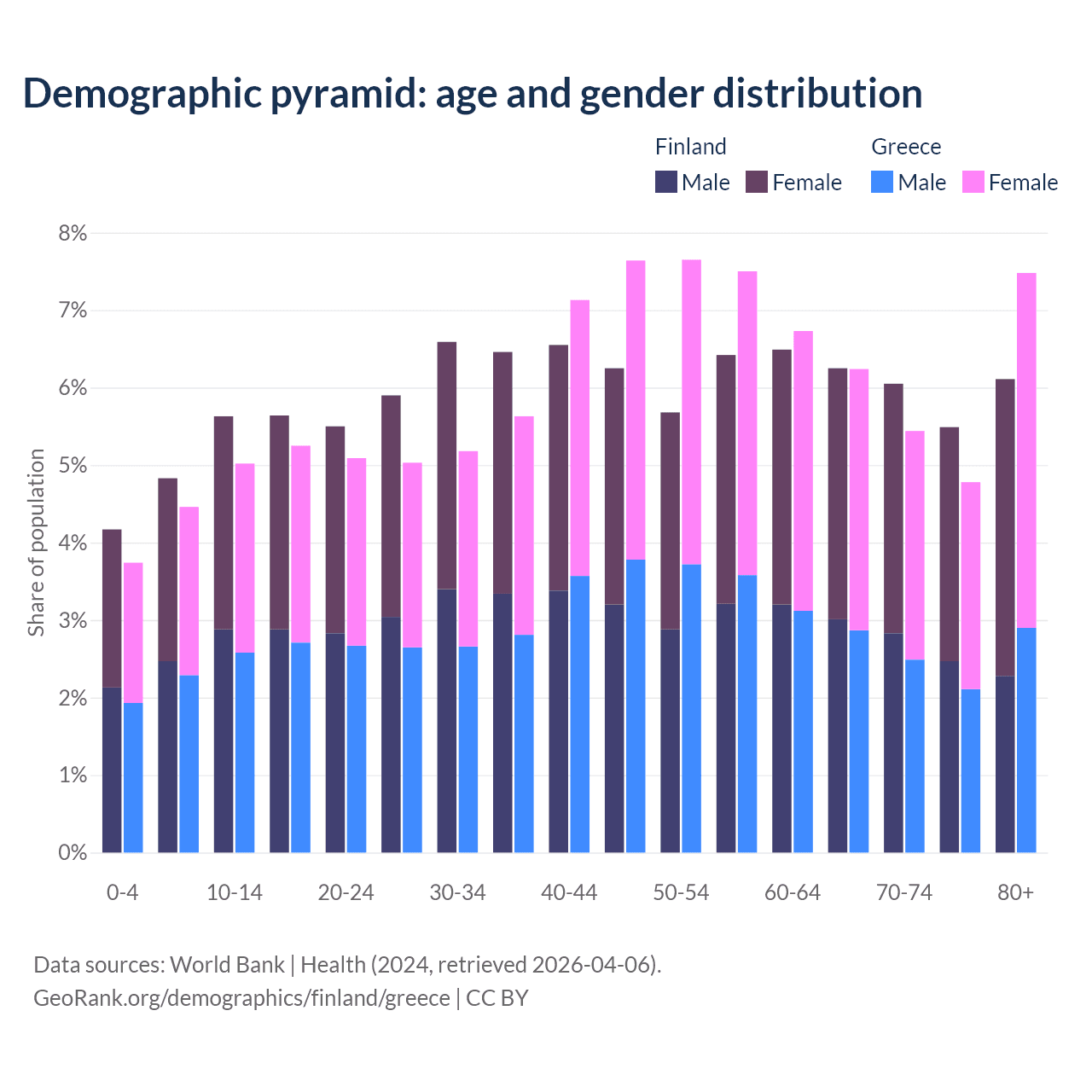 - Finland is ranked 22/196 by median age (oldest to youngest) vs 6/196 for Greece.