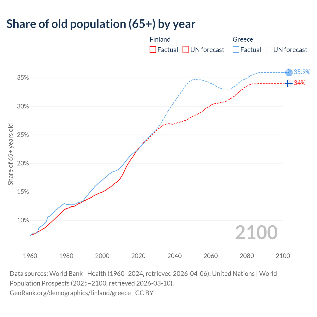 The share of older people aged 65 and over is 23.9% in Finland and 23.9% in Greece. Life expectancy in Finland compared to Greece .