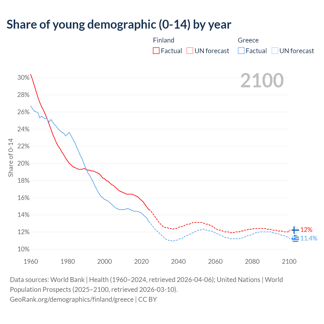 - The share of young demographic (0-15 years old) in Finland is 14.6% vs 13.2% in Greece.