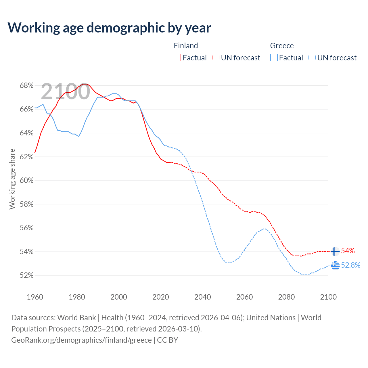 - Finland has 3.46M working age adults (aged 15-64) vs 6.4M in Greece.