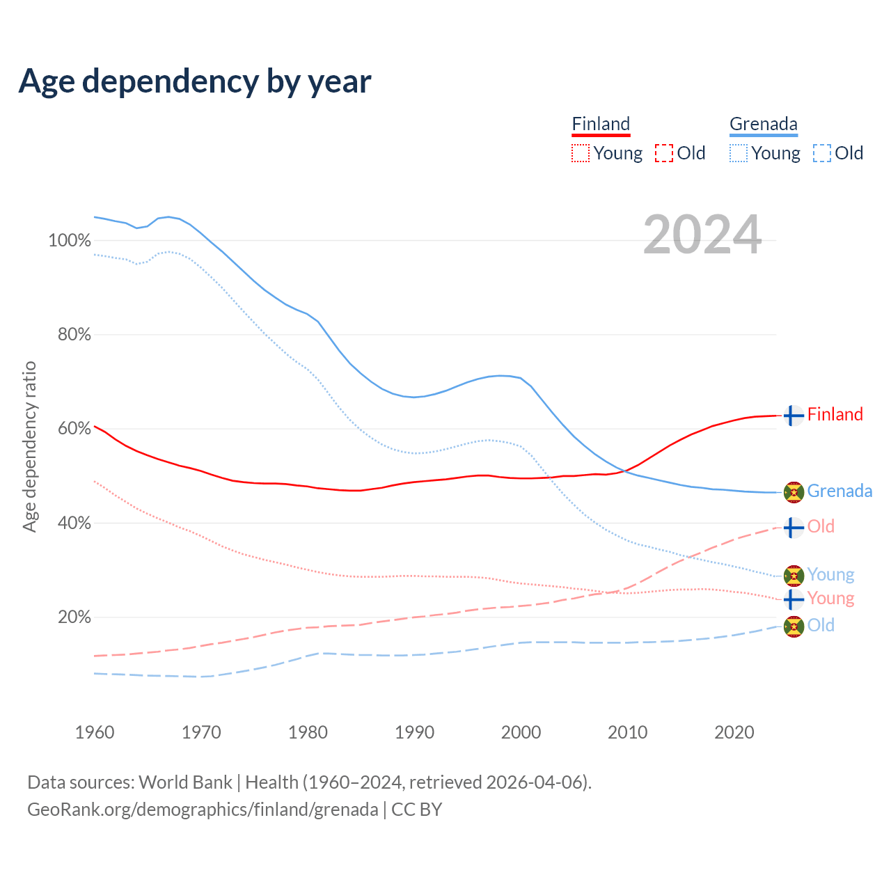 - The share of old-age demographic (65+) in Finland is 23.9% vs 12.2% in Grenada.