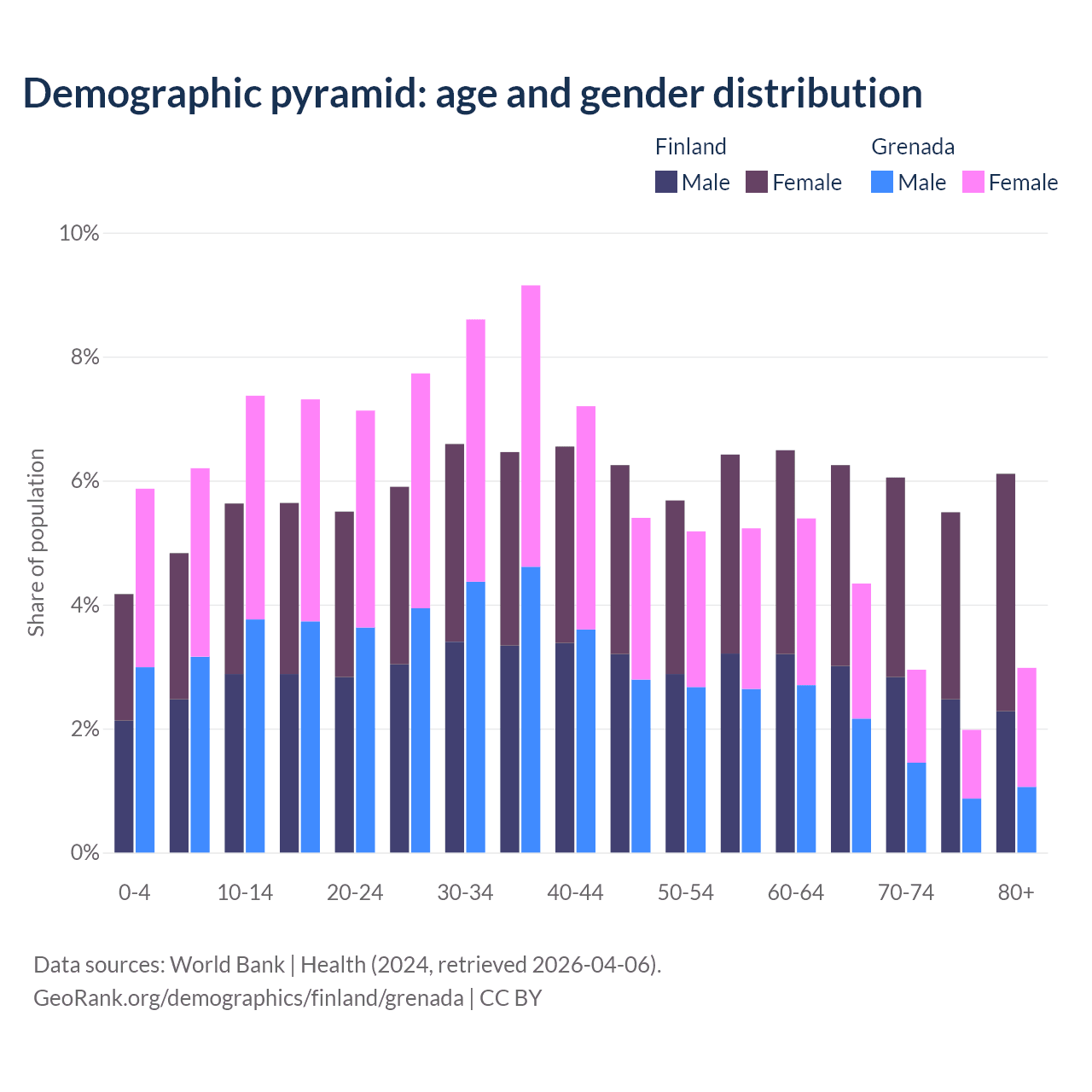 - As of 2026, the population of Finland is 5.63M vs 117K in Grenada - 48 times difference.